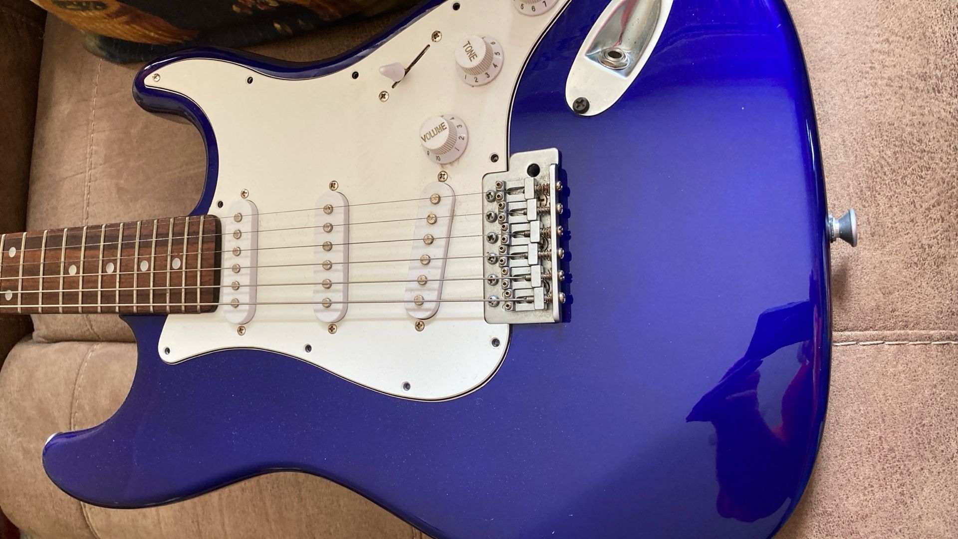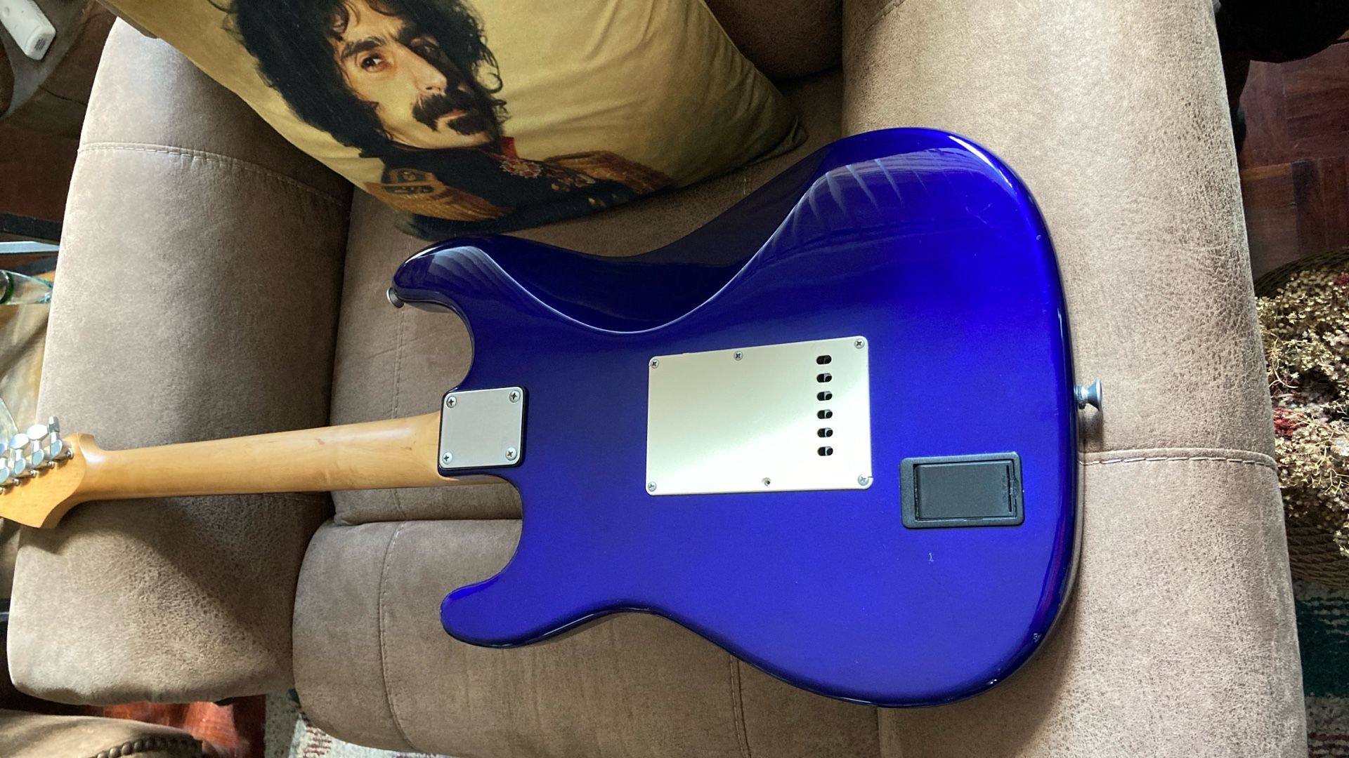 Very clean vintage guitar, plays well with a nice Rosewood Fretboard. Deluxe model with matte chrome hardware and Rosewood fretboard. Cool blue metallic finish that turns dark or to a purple blue in the light. Guitar trades considered. Body Color: Blue Metallic. Size: 4/4. Right-handed. Type: Electric. Brand: Aria.