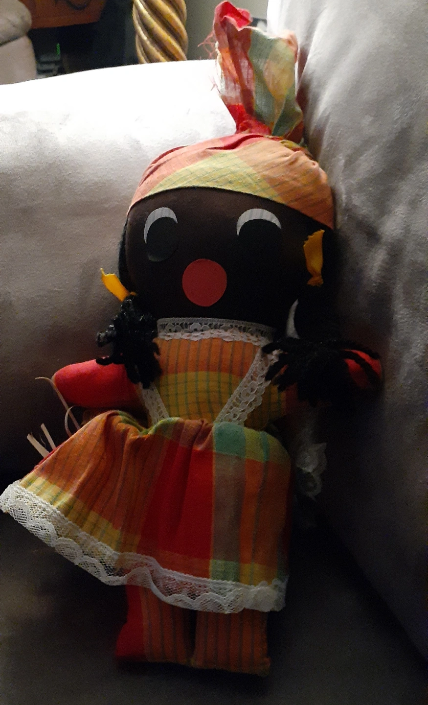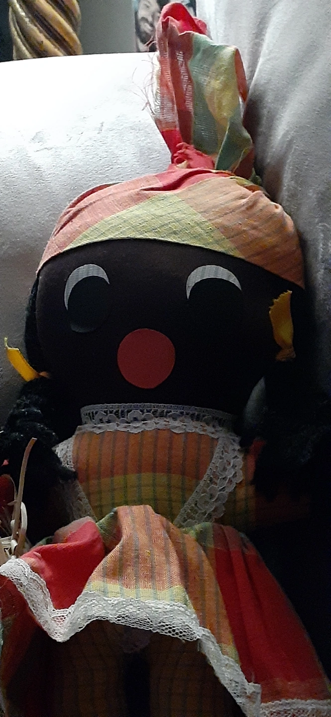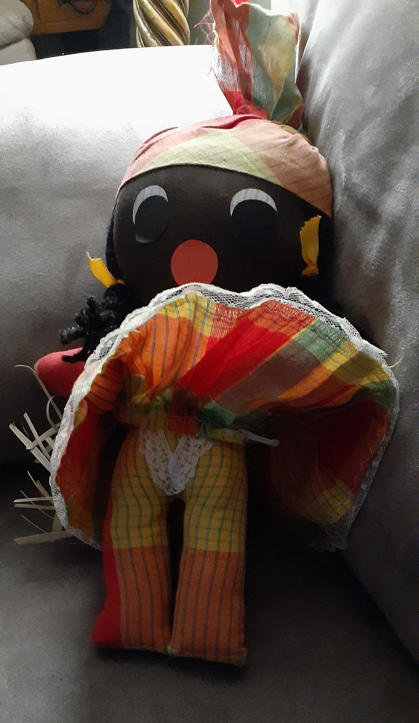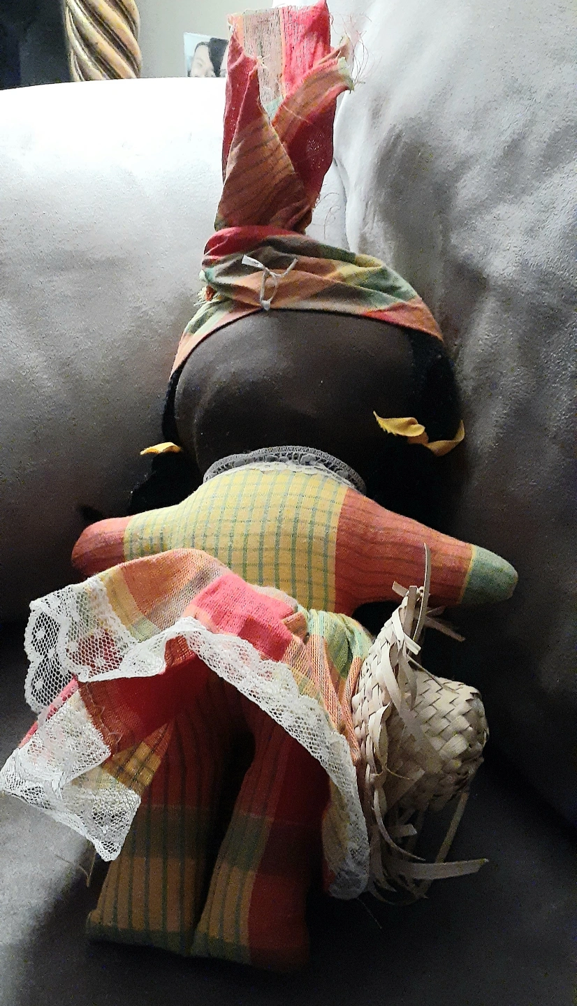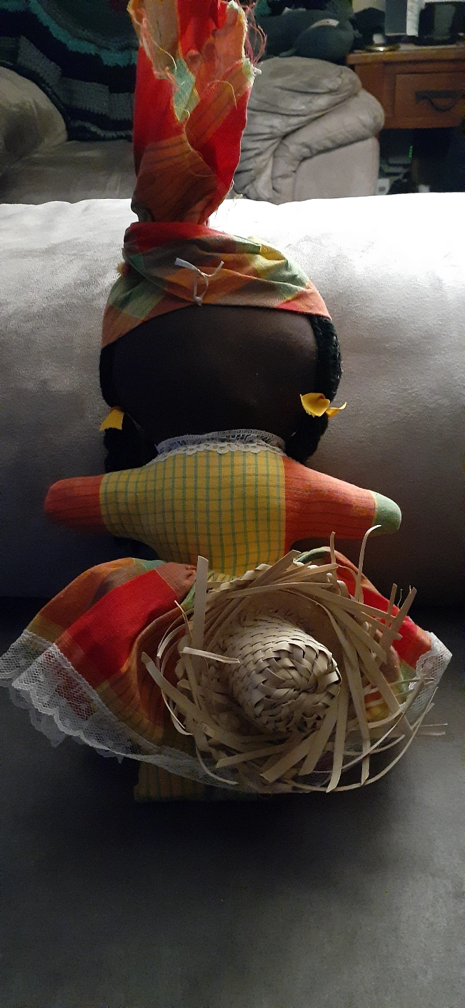 Unique handcrafted doll. Features a dark-coloured face, brightly coloured plaid dress, and a woven basket accessory. Shows some wear consistent with age.