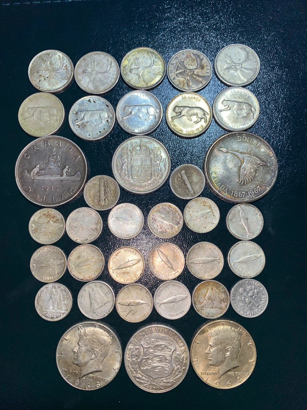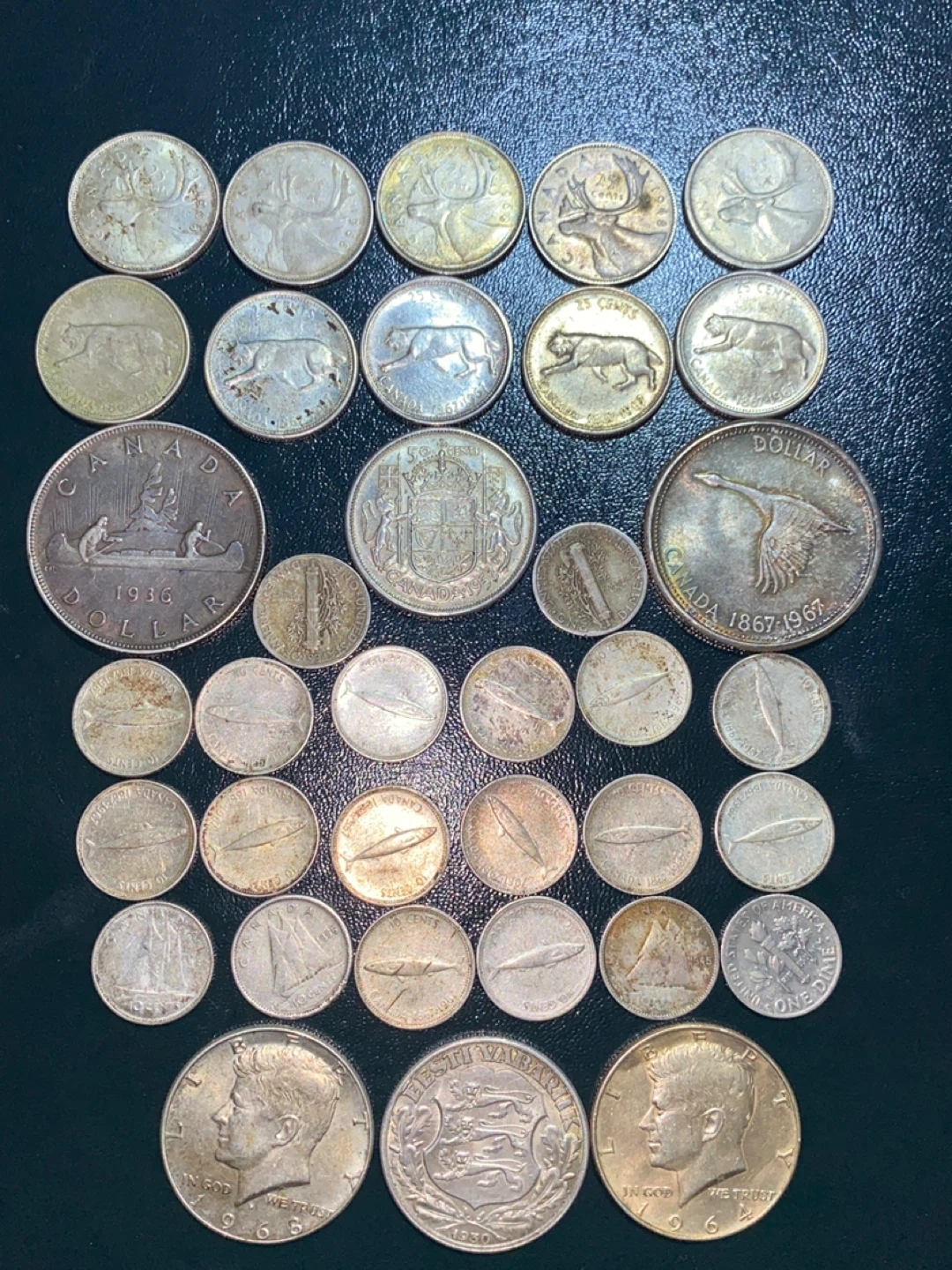 A diverse silver collection of Canadian and US coins, including various denominations and years. Features several wildlife motifs and portraits of past leaders. This lot includes a 1936 Canadian dollar coin and a 1967 Canada Centennial dollar coin. Some US half dollars are also present.