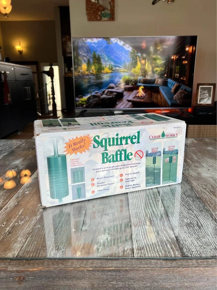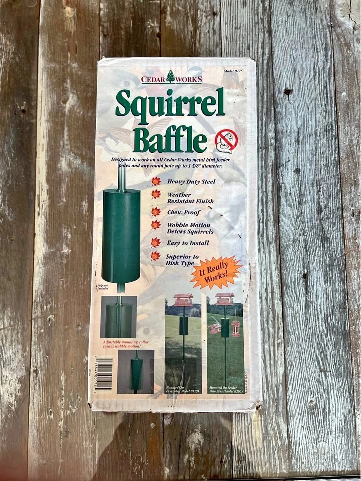 This is a new Cedar Works Squirrel Baffle, designed to mount on all Cedar Works metal bird feeder poles and any round pole up to 1 5/8" diameter. This heavy duty steel baffle features a weather resistant finish, is chew-proof, and uses wobble motion to deter squirrels. It is easy to install and is superior to disk-type baffles. Keep those pesky squirrels away from your bird feeders! Heavy Duty Steel, Weather Resistant Finish, Chew-Proof, Wobble Motion Deters Squirrels, Easy to Install, Superior to Disk Type.