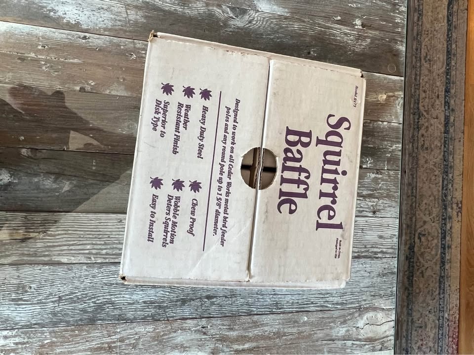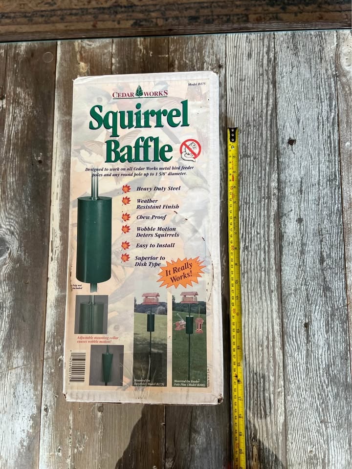 This is a new Cedar Works Squirrel Baffle, designed to mount on all Cedar Works metal bird feeder poles and any round pole up to 1 5/8" diameter. This heavy duty steel baffle features a weather resistant finish, is chew-proof, and uses wobble motion to deter squirrels. It is easy to install and is superior to disk-type baffles. Keep those pesky squirrels away from your bird feeders! Heavy Duty Steel, Weather Resistant Finish, Chew-Proof, Wobble Motion Deters Squirrels, Easy to Install, Superior to Disk Type.