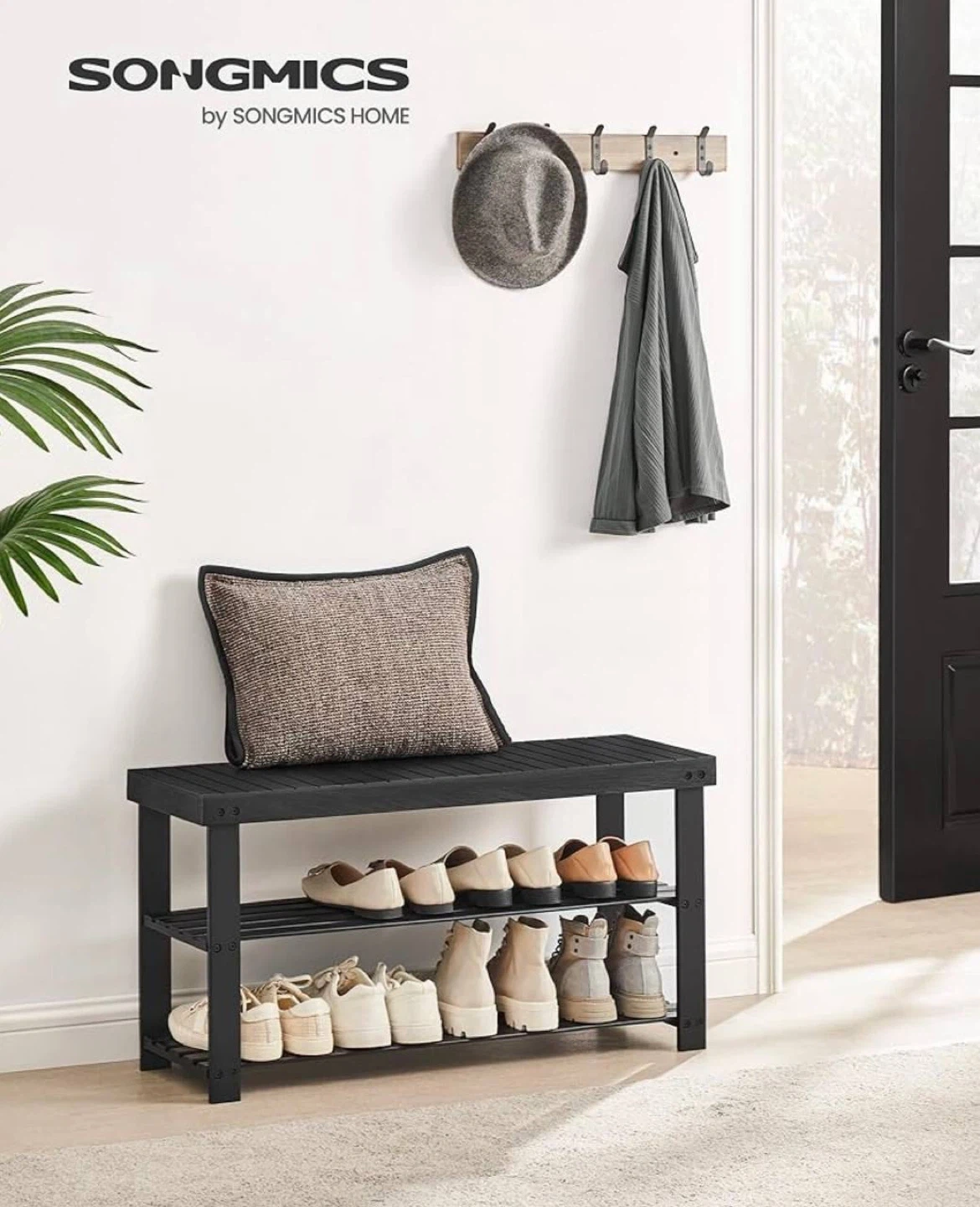 Stylish and functional shoe rack bench from SONGMICS, designed to keep your entryway organized while also providing a comfortable seating area. The minimalist bamboo design with an ink black finish fits perfectly in modern, Scandinavian, or natural-style interiors.