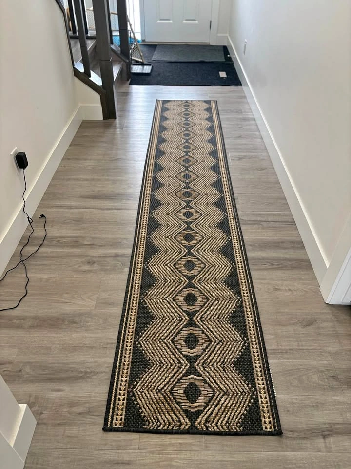 Modern geometric runner rug in great condition – perfect for hallway, entryway, or even outdoor use. Size: 2 ft x 10 ft. Colour: Dark grey with beige pattern. Durable flatweave (easy to clean). Indoor/outdoor use. Includes rug pad. Less than 1 year old – selling due to moving. Pick up Carrington NW.