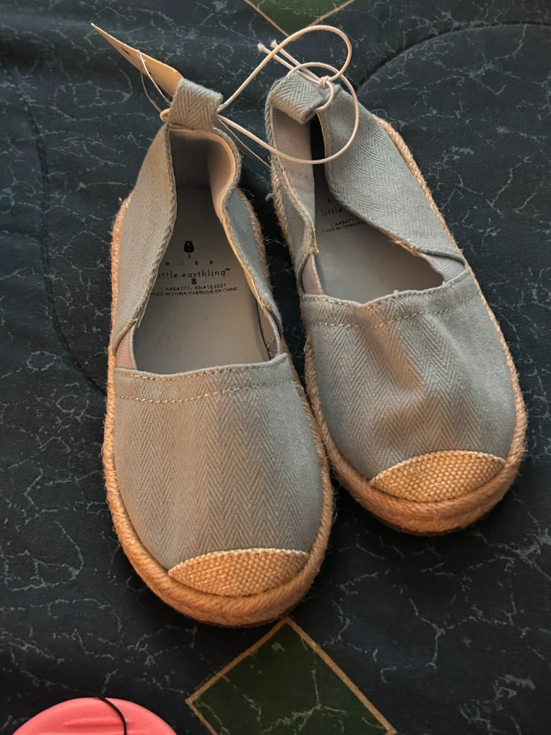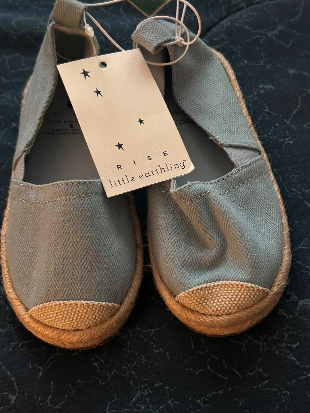 These Little Earthling espadrille flats are a lovely light blue colour. They feature a herringbone textile upper and a jute sole. They're super comfortable for everyday wear!