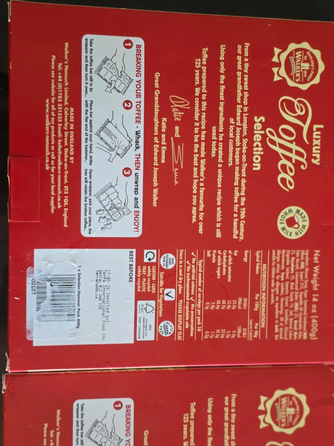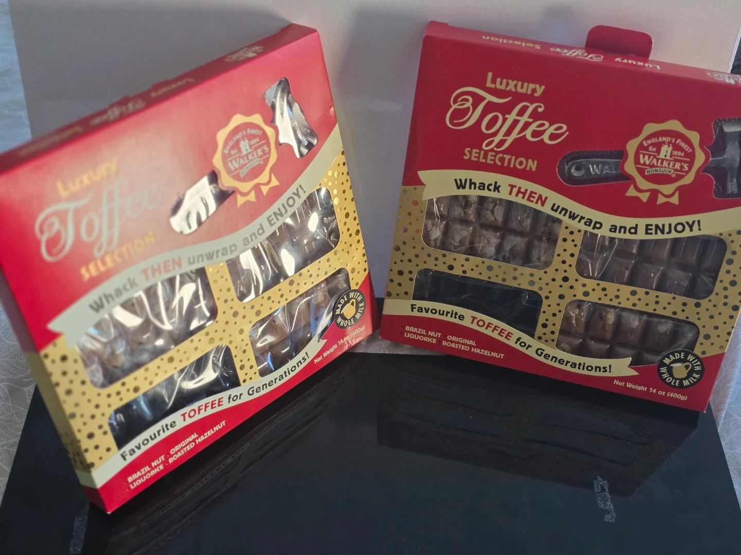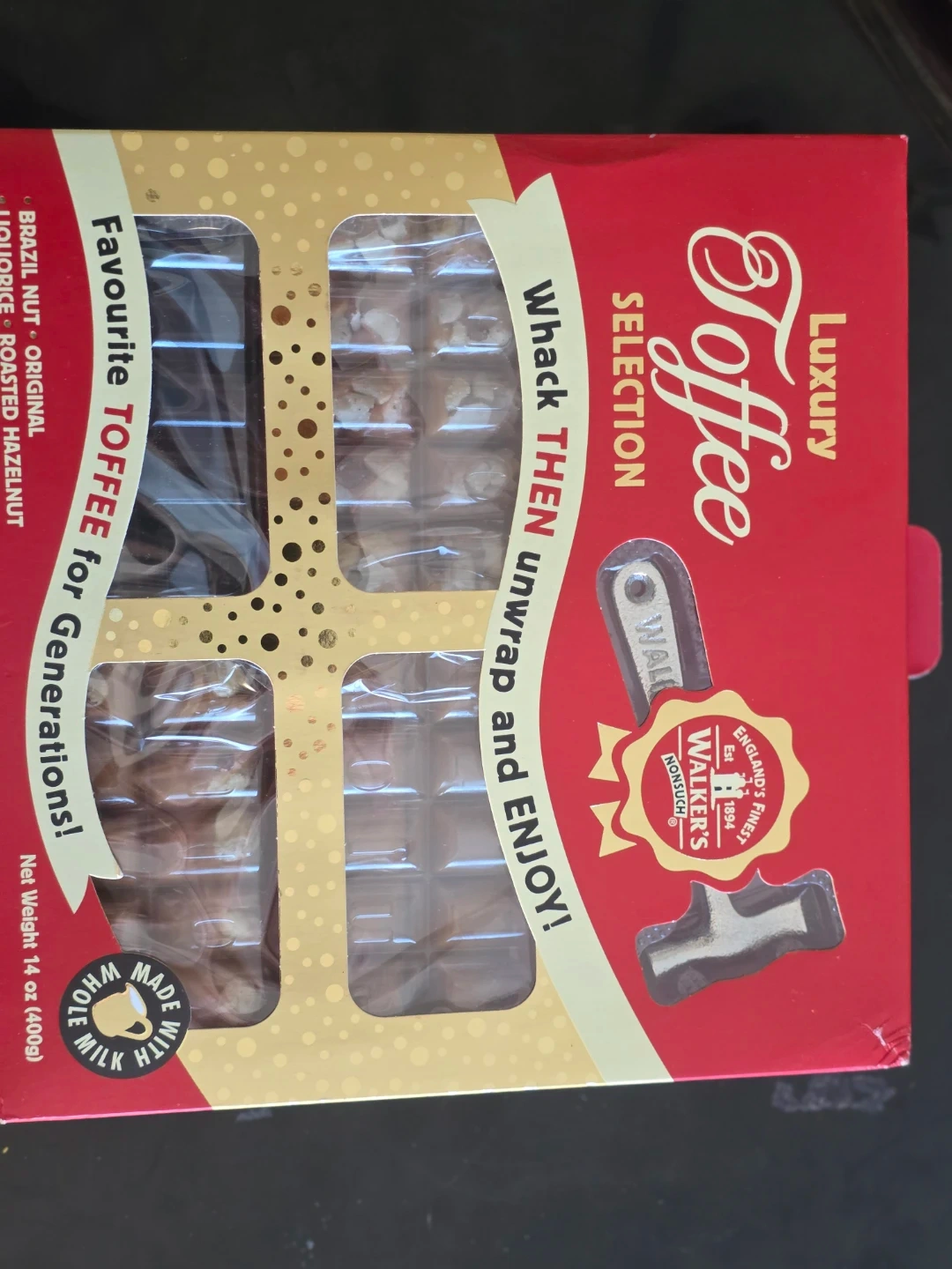 The item shown is a Walkers Nonsuch Luxury Toffee Selection Hammer Pack, which includes four 100g toffee bars and a traditional toffee hammer for breaking them.
