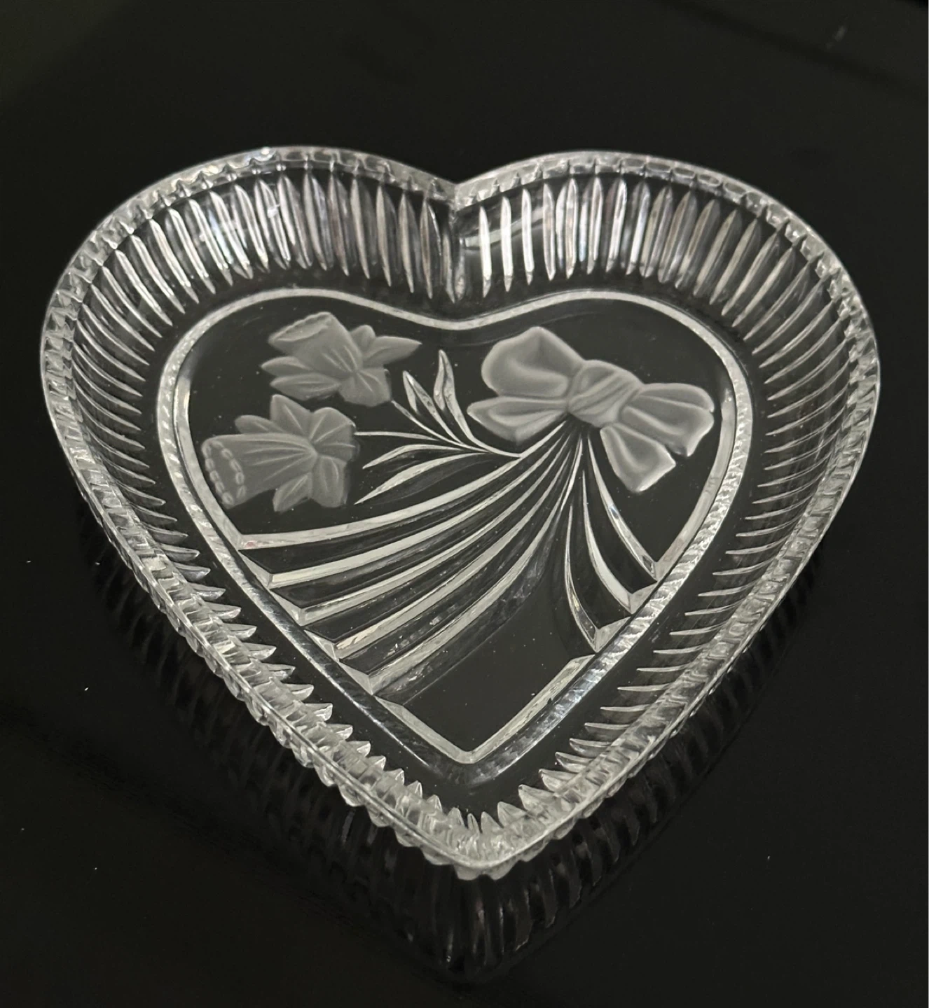 Clear glass trinket dish in a heart shape. It's decorated with a raised floral and ribbon design. Glass material.