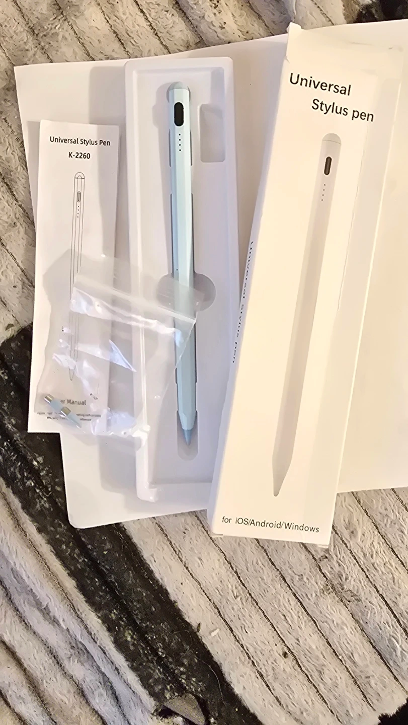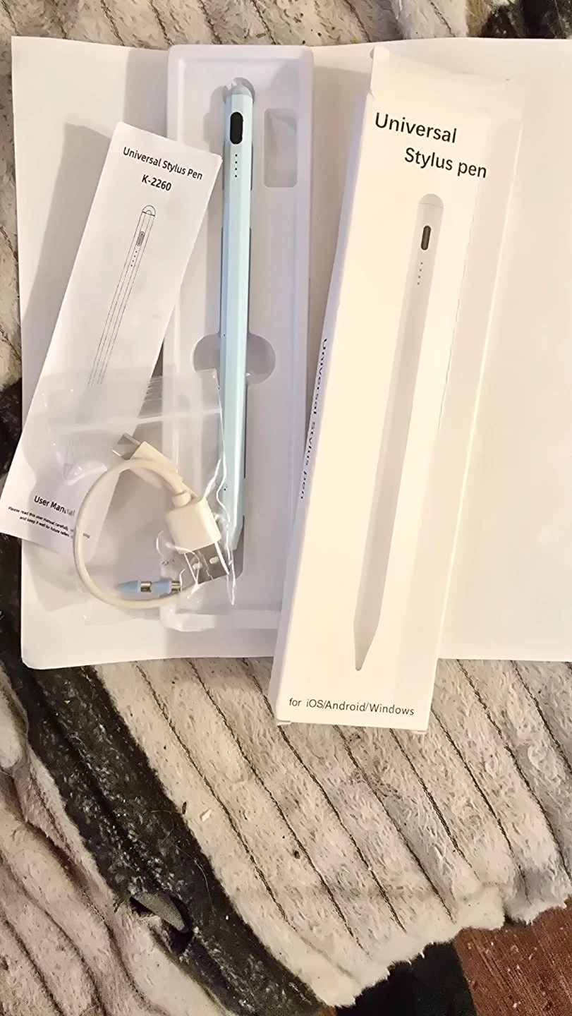 This is a universal stylus pen for iOS, Android, and Windows devices. It comes with a user manual and charging cable. It's a light blue colour.