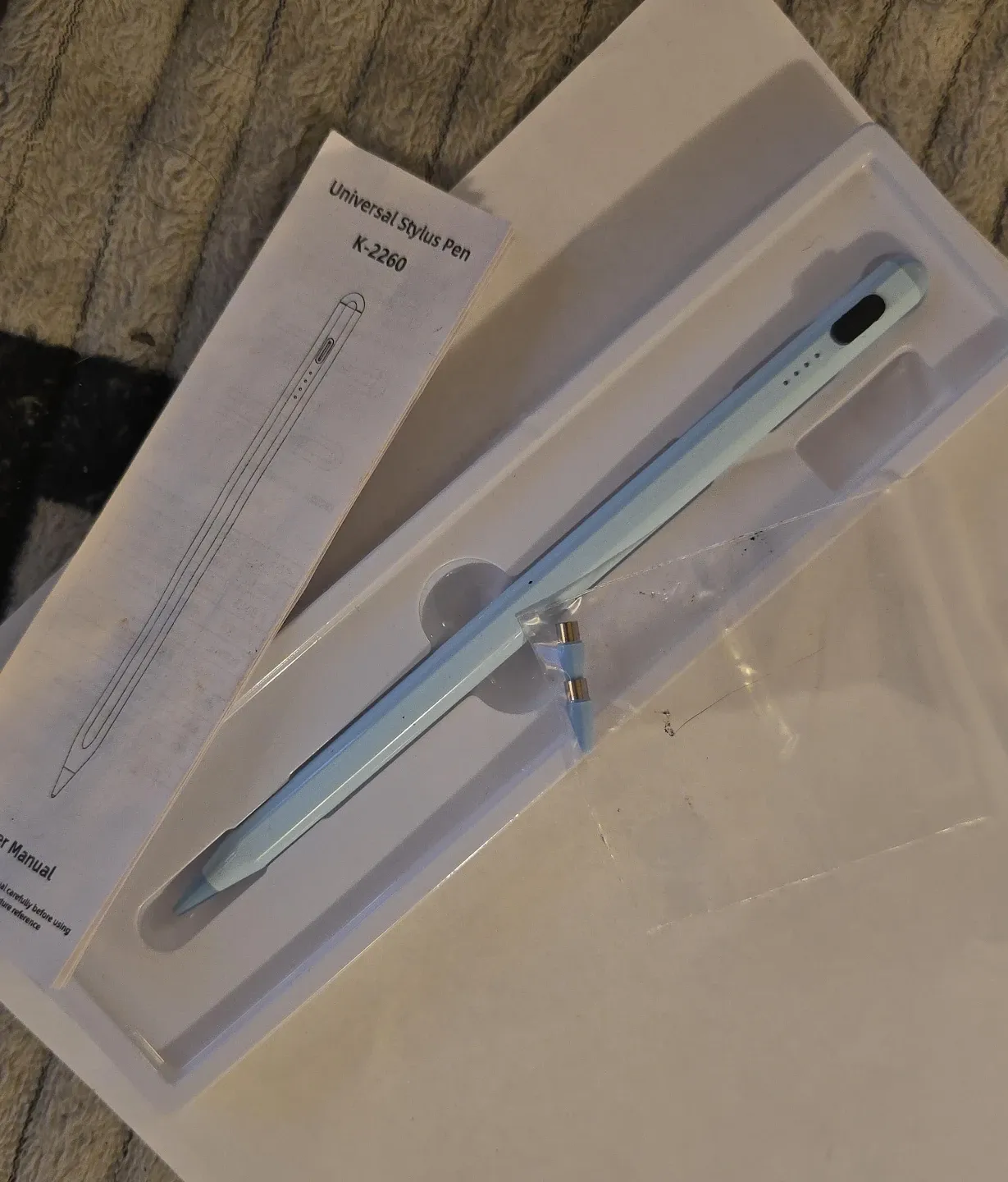 This is a universal stylus pen for iOS, Android, and Windows devices. It comes with a user manual and charging cable. It's a light blue colour.