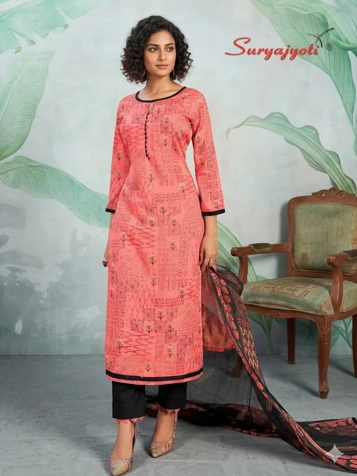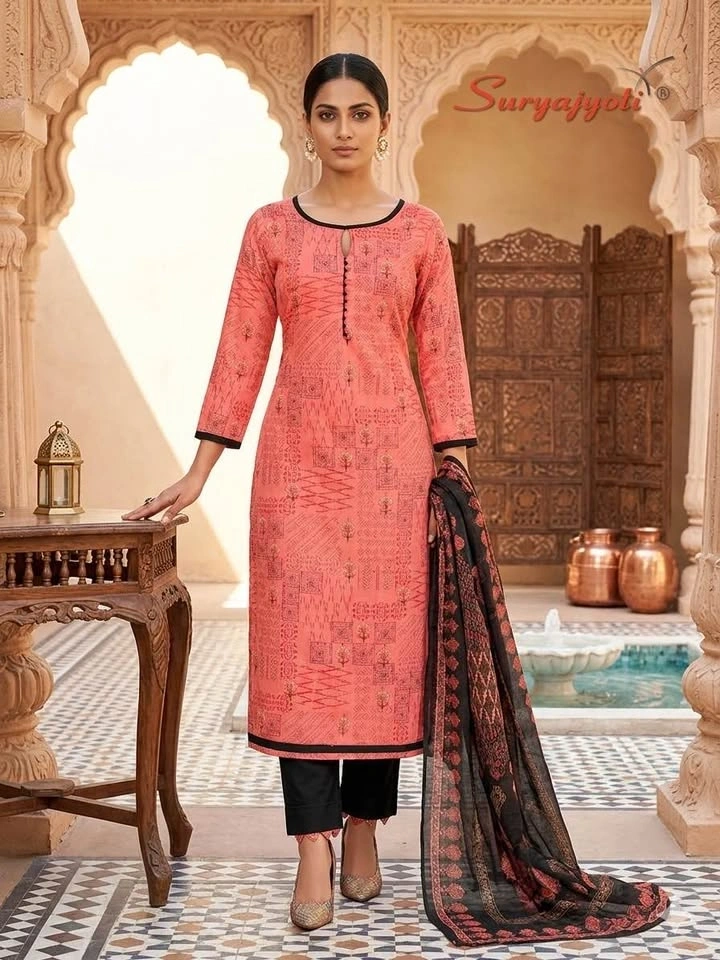 Stylish Suryajyoti material set. Comes with a peach colored kurta, black pants, and a black patterned dupatta. Kurta has cool black print designs and black trim. Great for casual wear or dressing up a bit.