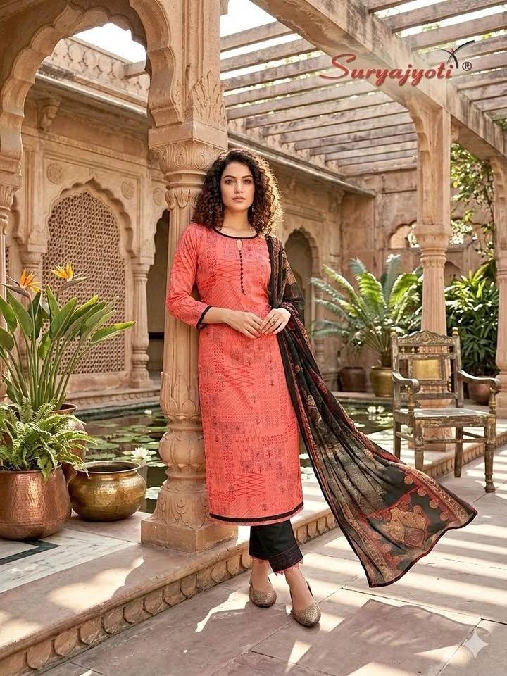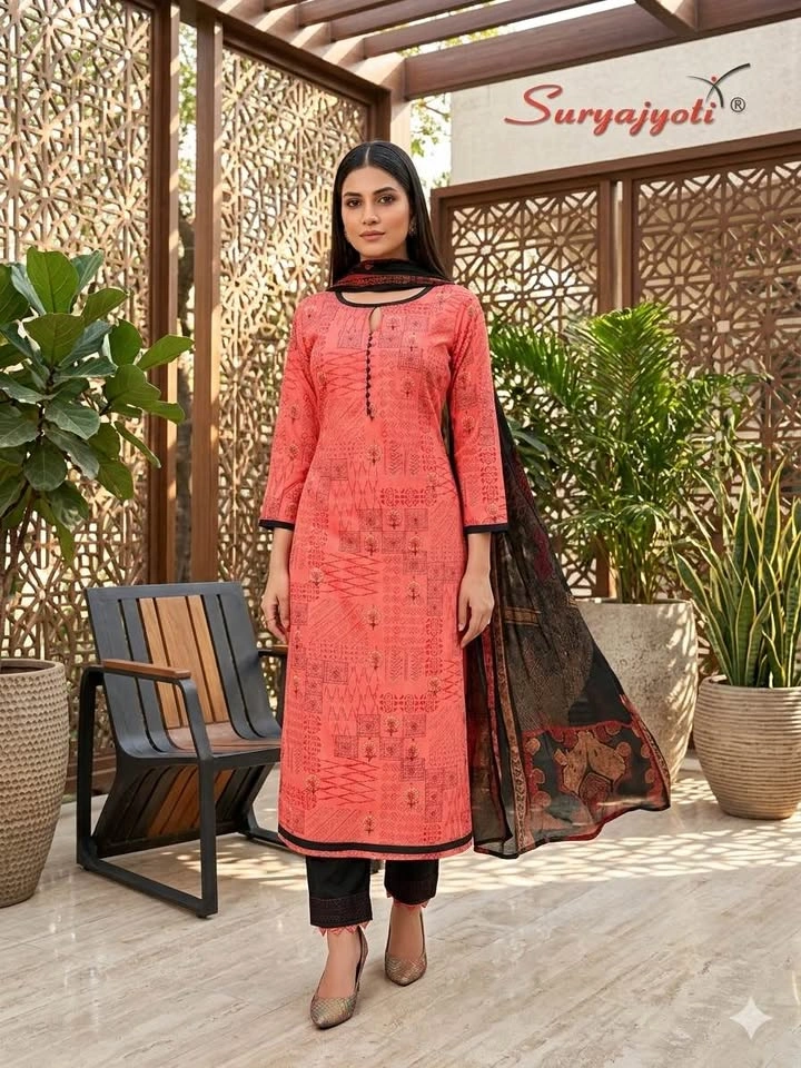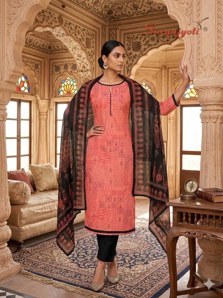 Stylish Suryajyoti material set. Comes with a peach colored kurta, black pants, and a black patterned dupatta. Kurta has cool black print designs and black trim. Great for casual wear or dressing up a bit.