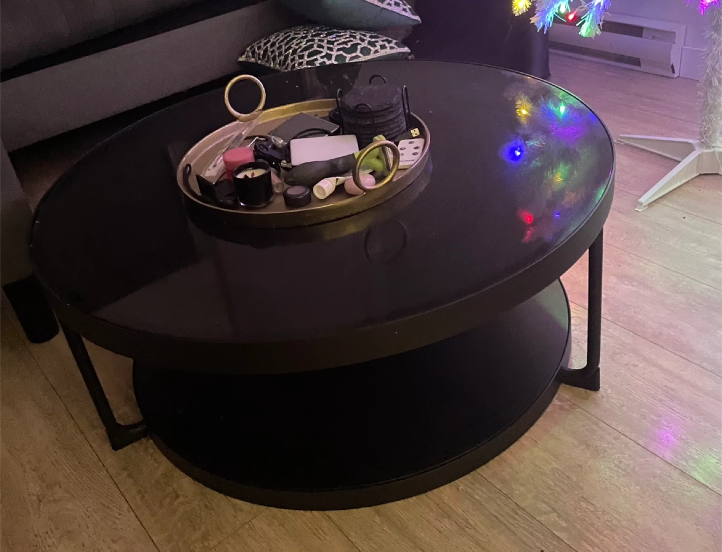 Black coffee table. It has a diameter of 88 cm and a height of 35. Sleek glass top and a reverse black Matte black bottom ( it also has a marble print on the other side) but I chose to use the all black side. You can reverse this if you prefer. I’ve had mine for 6 months and it’s in impeccable condition.