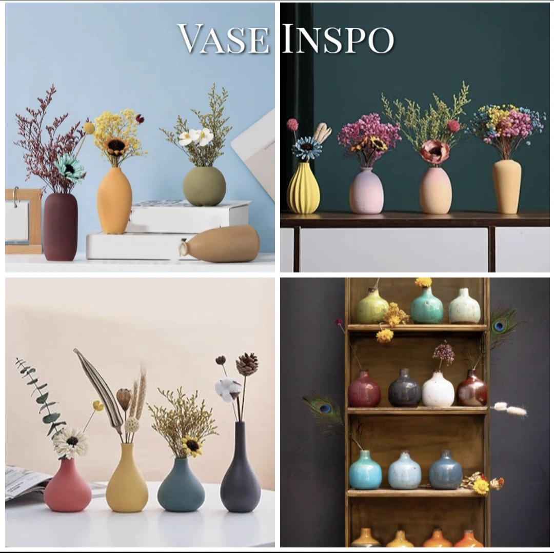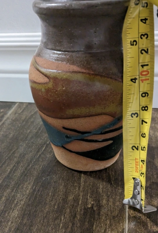 Unique, hand-painted pottery vase. Features earthy tones and abstract design. Approximately 6 inches high.