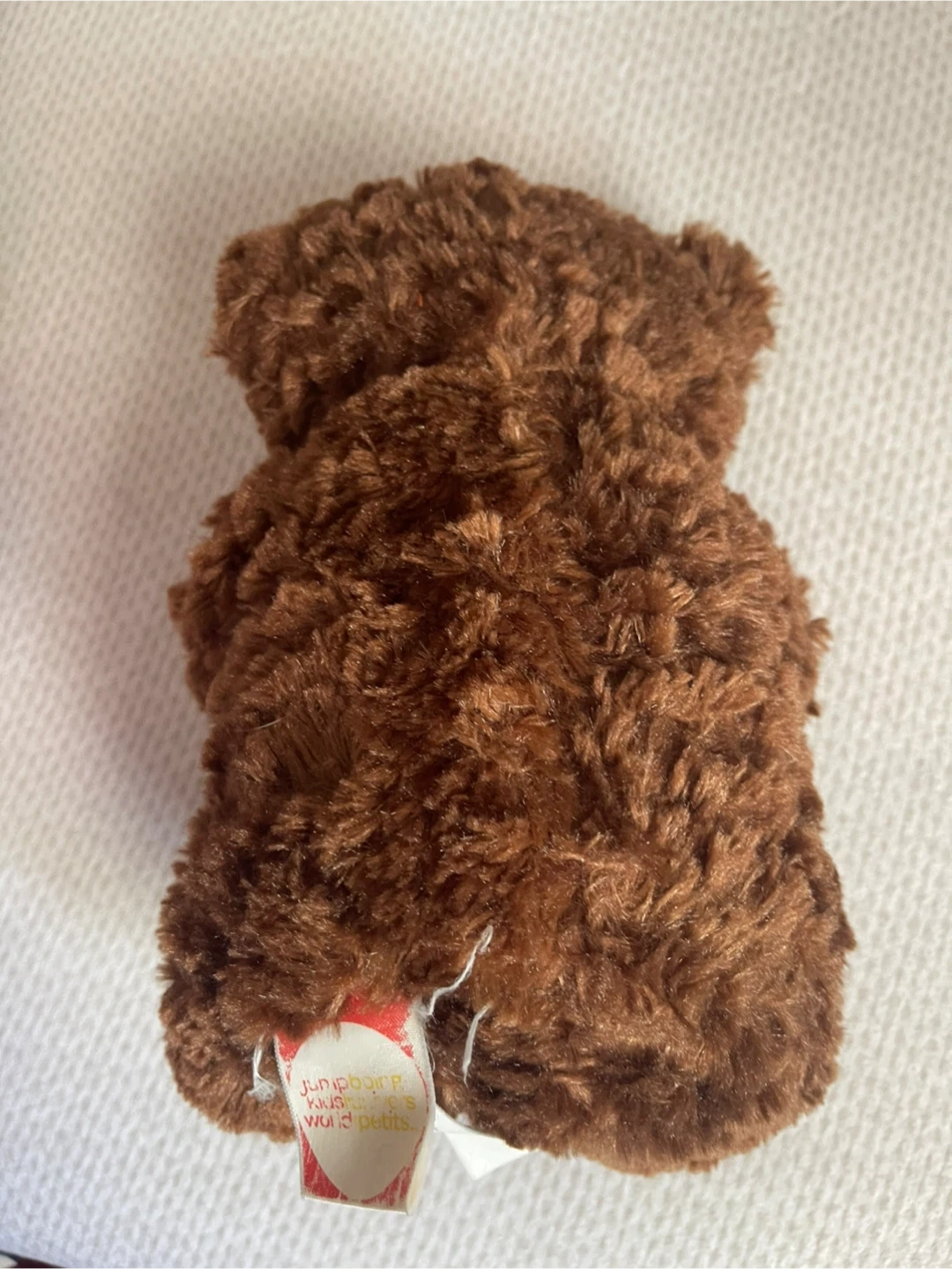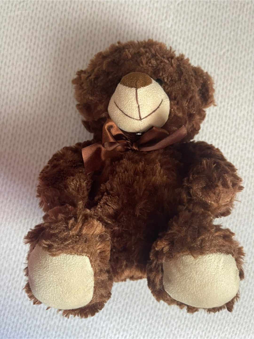 This is a soft, fluffy brown teddy bear with a satin bow around its neck. It has a friendly embroidered smile and beige paw pads. It's a cuddly plush toy. Cash only.