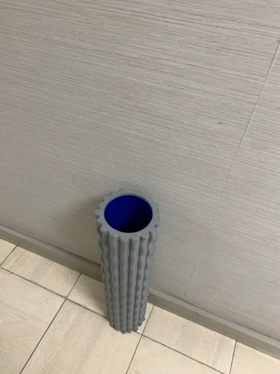 Grey textured foam roller with a blue inner core. It's designed for muscle recovery and massage. Great for post-workout stretching!