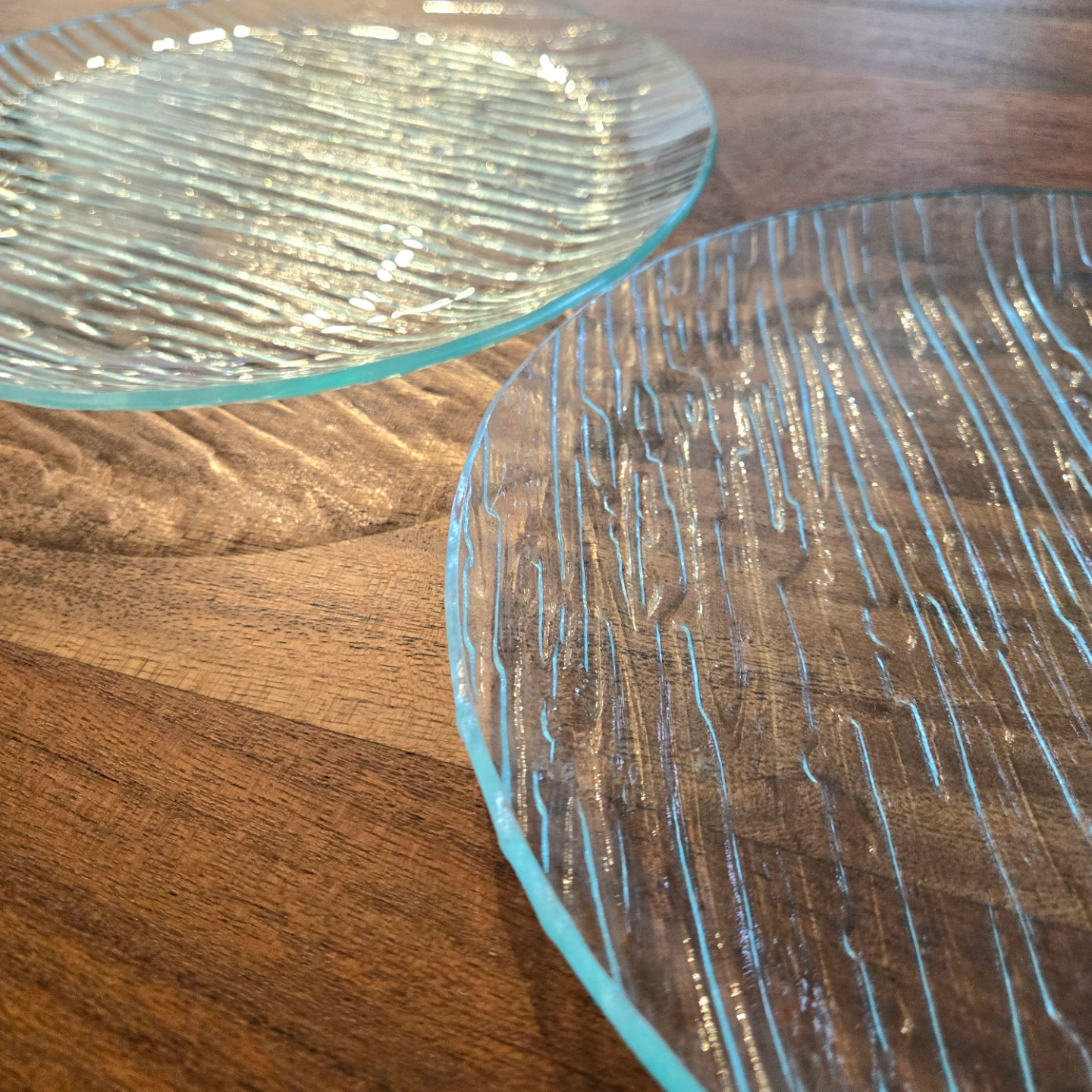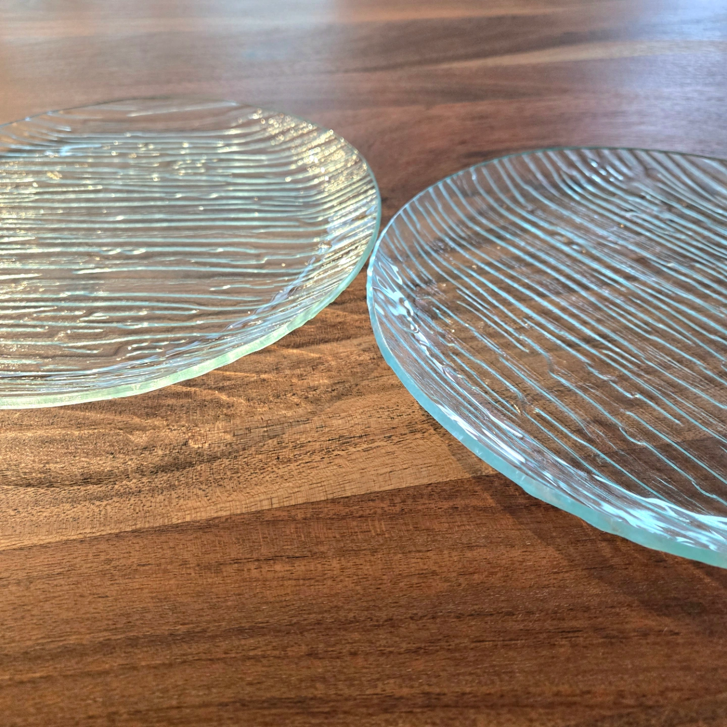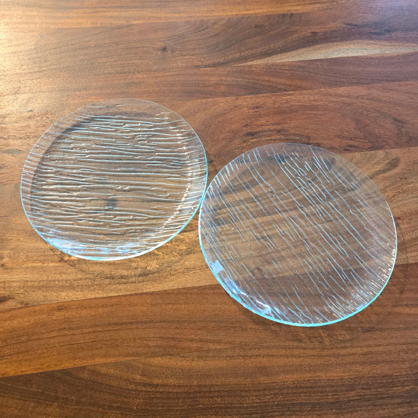 Two clear glass plates. Round shape. Textured surface. Approximately 9.5" inches in diameter.