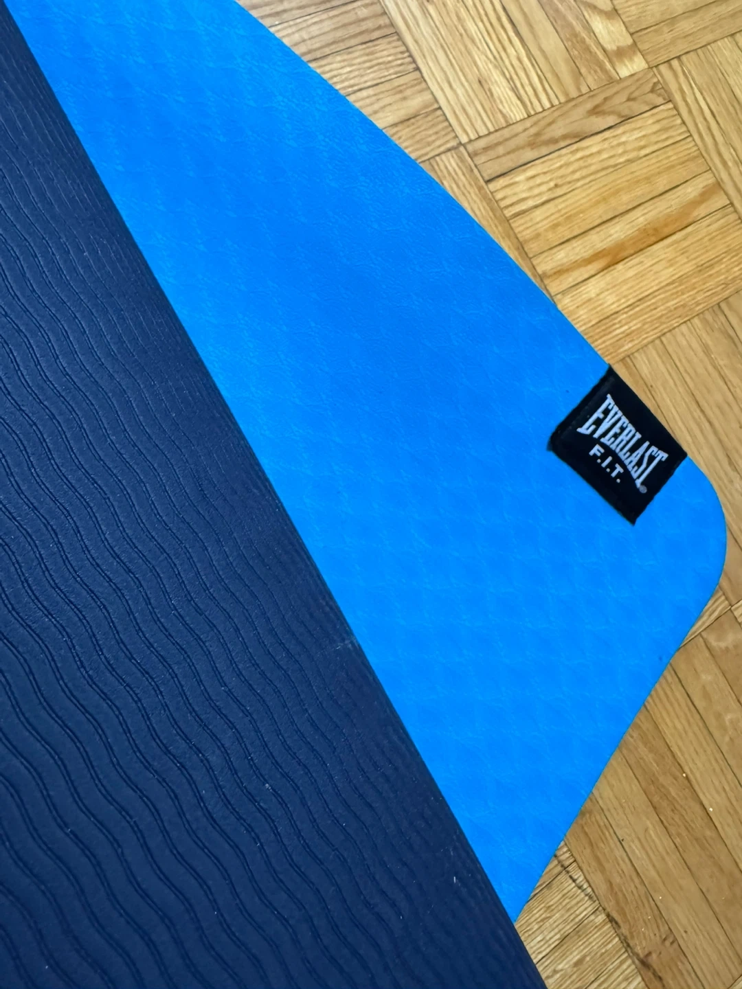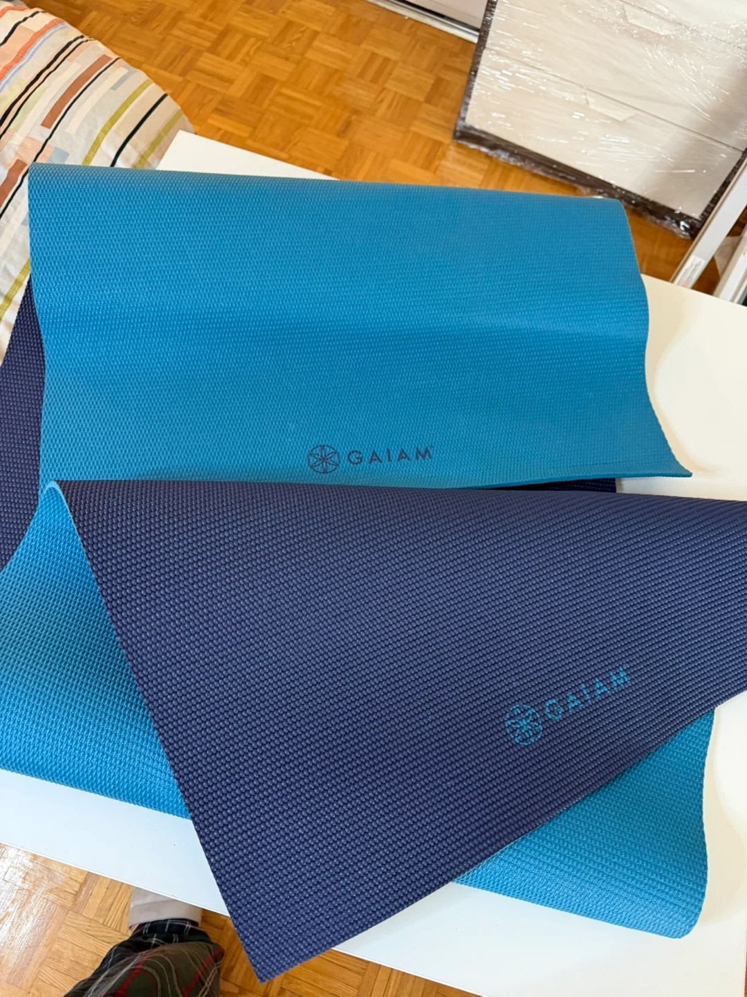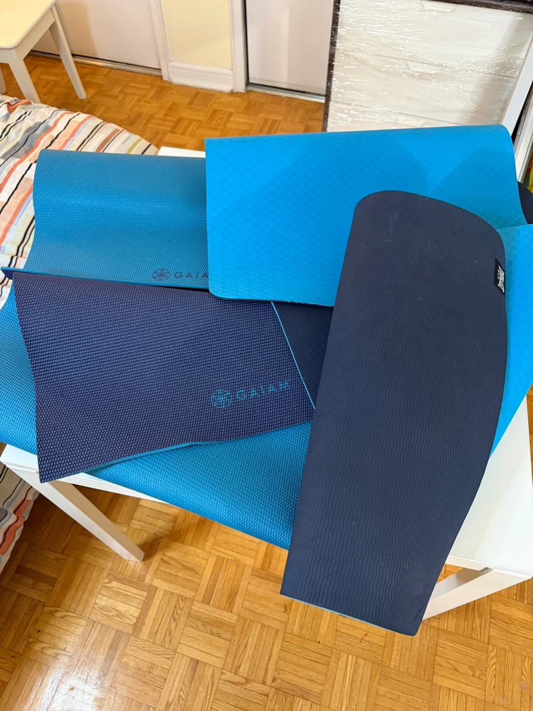 Includes two Gaiam yoga mats in blue and dark blue, plus one Everlast mat in bright blue. Non-slip texture for stability. Great for yoga or floor exercises!
