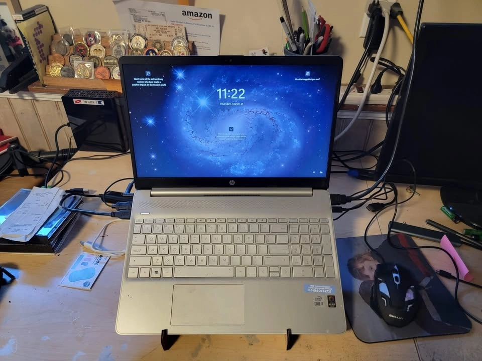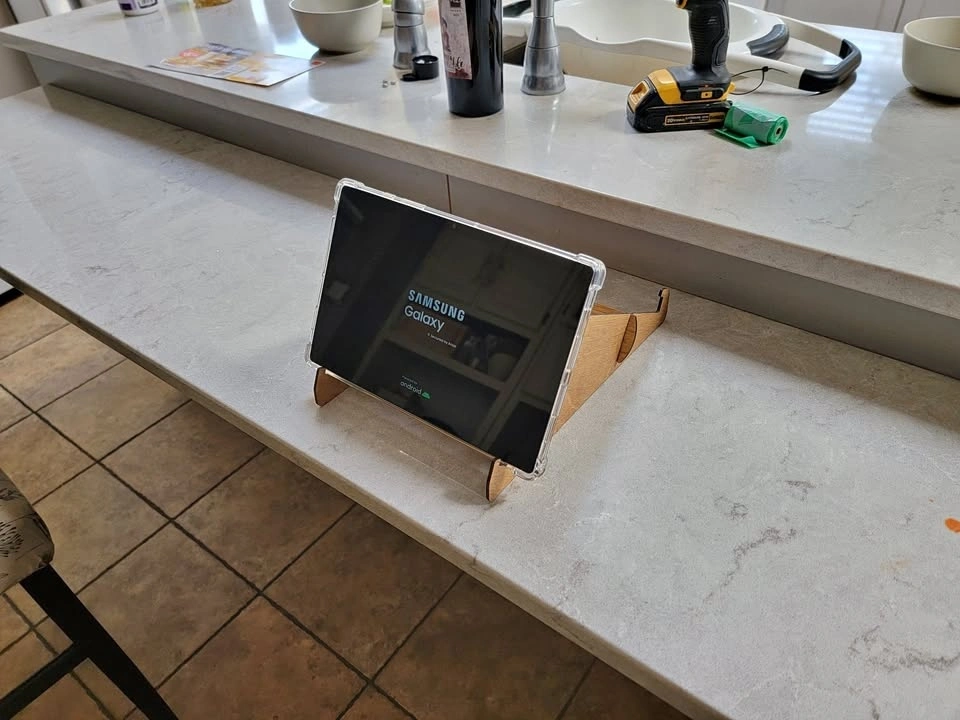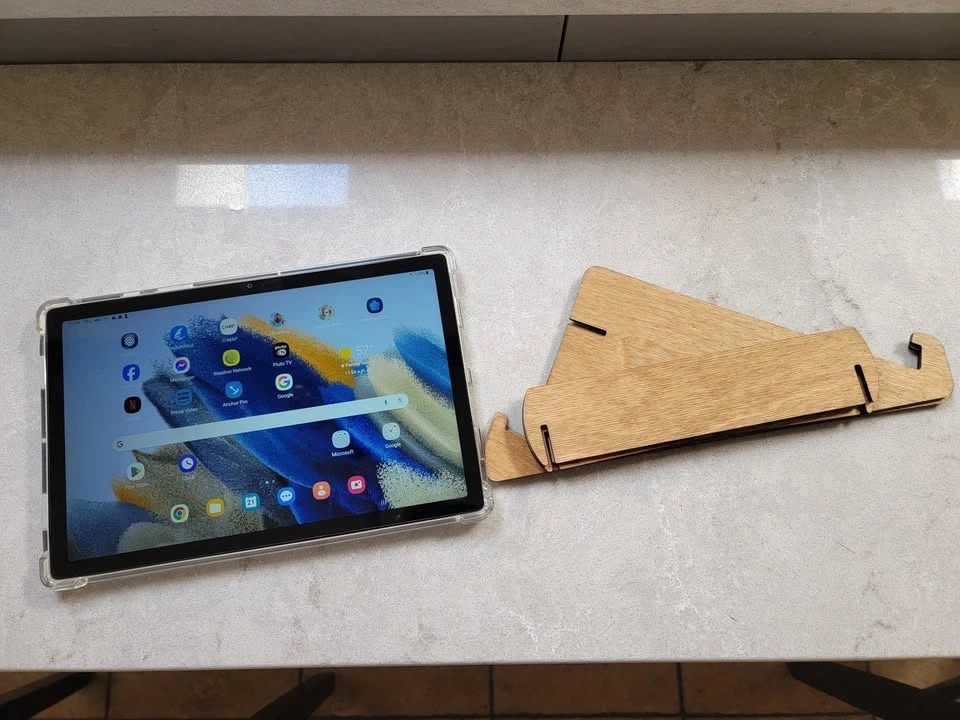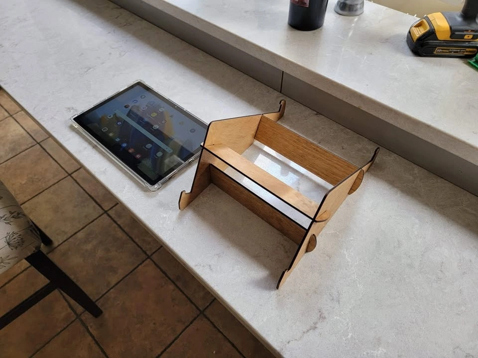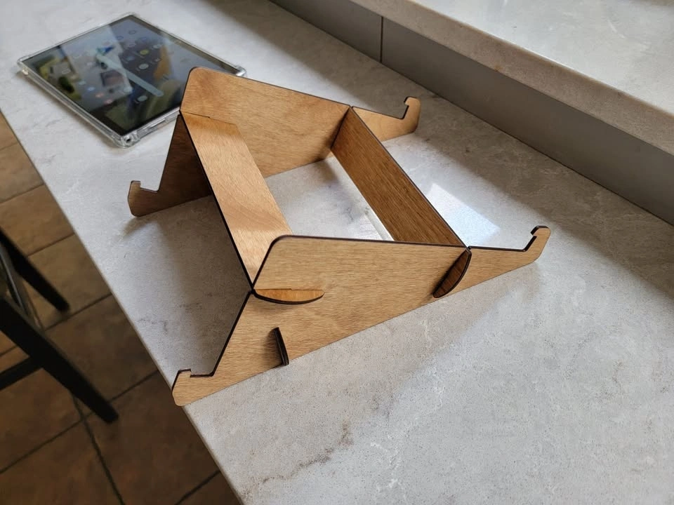 These stands can be custom engraved and made to order. Right now I have a painted one (Yellow) and a Clear Wood stained one as shown in Photos. Made from Baltic Birch. Can easily make more. Shown here with my Samsung A8 Tablet and an HP Laptop of mine. Happy to answer any questions. Folds up flat for portability if you don't want to glue it together and leave it assembled.