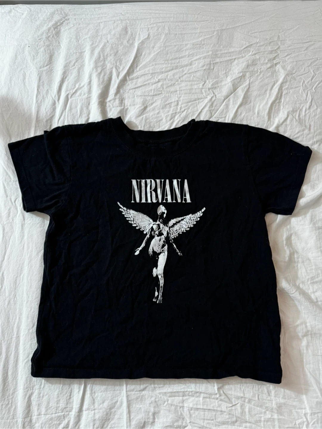 Black t-shirt with the iconic Nirvana angel graphic. Cotton material. Short sleeves. This tee's great for any grunge fan!