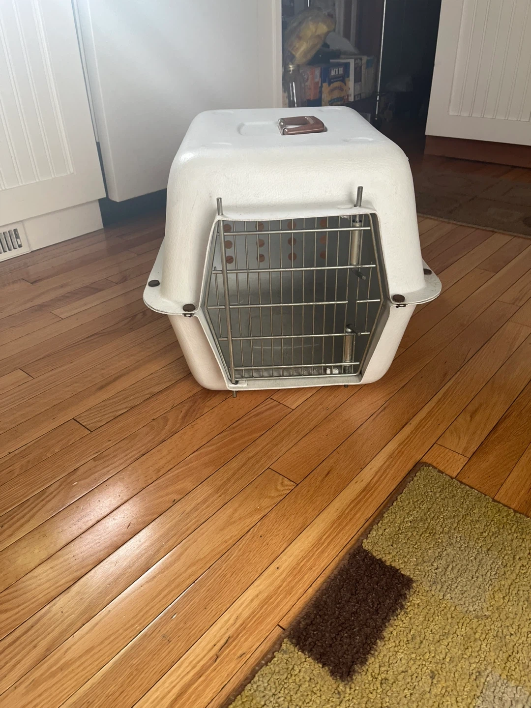 This is a sturdy white pet carrier. It has a metal latching door and ventilation holes on the sides. It's great for safely transporting small to medium pets. The top handle makes it easy to carry.