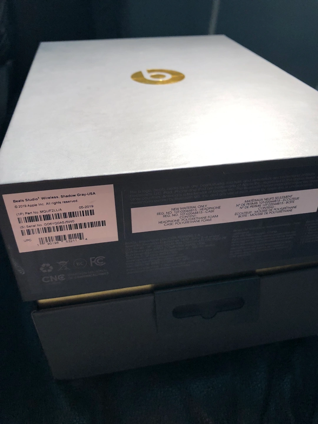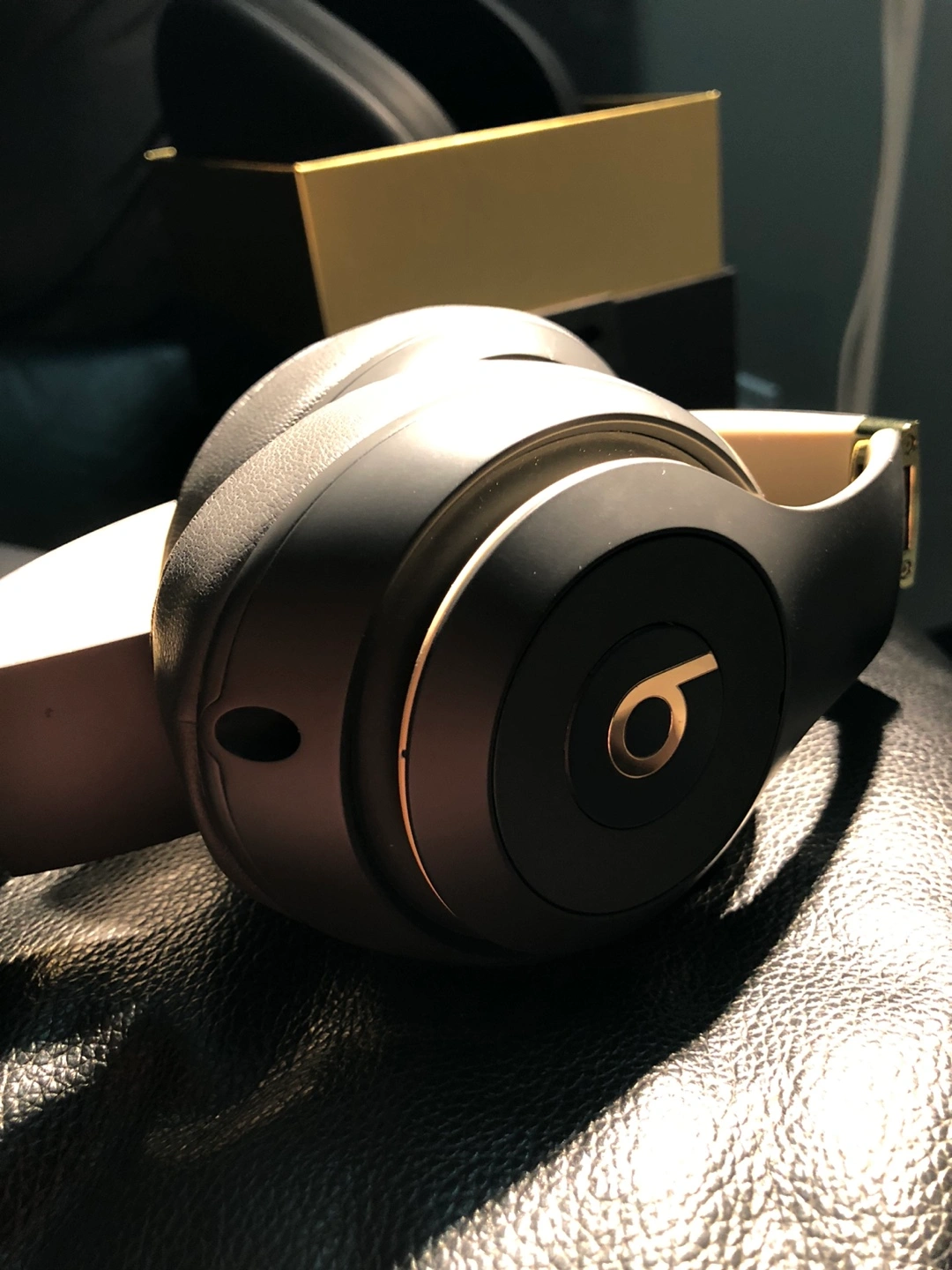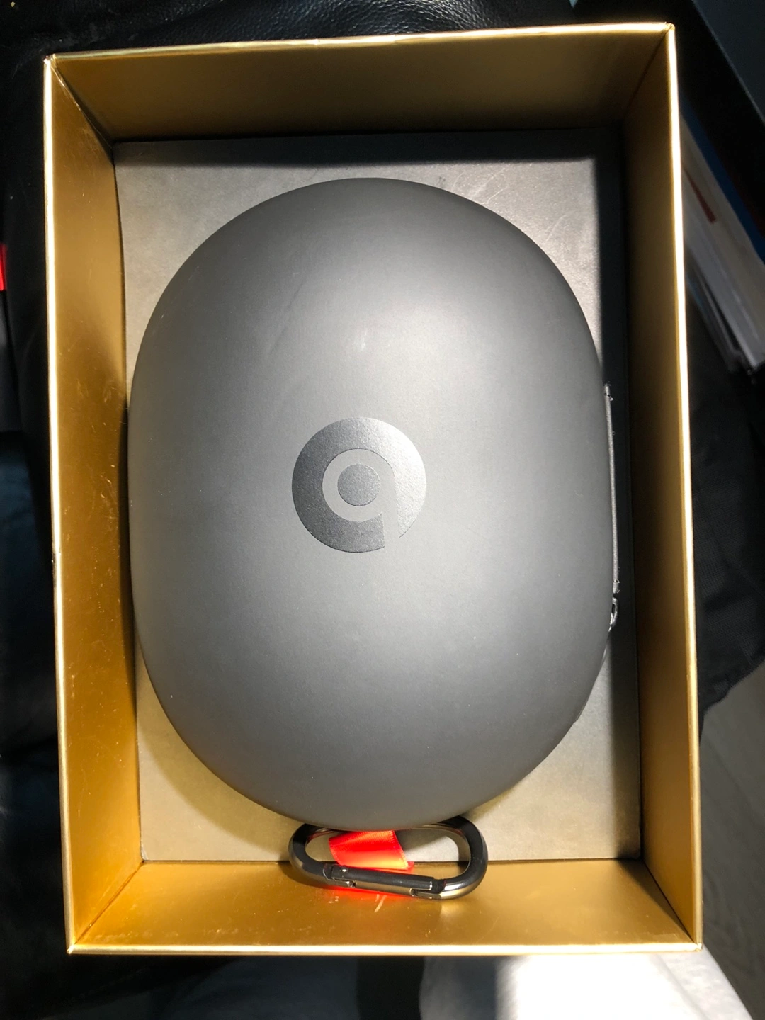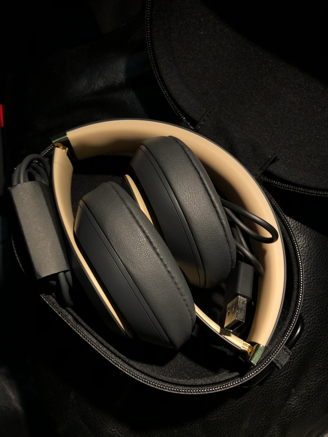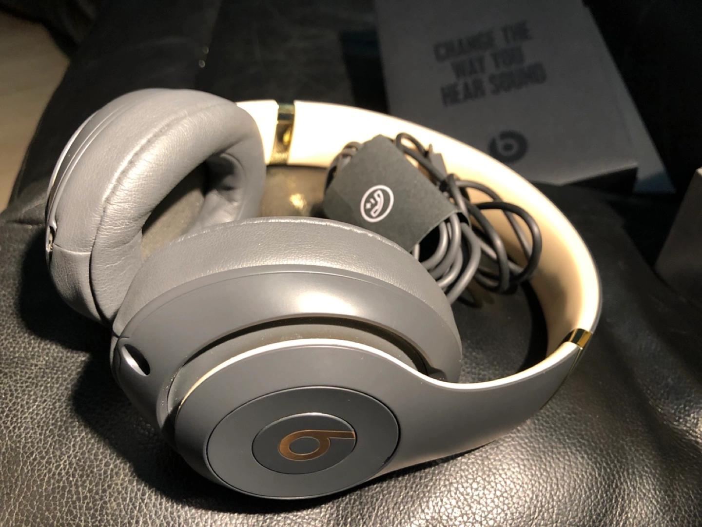 Grey beats headphones with a carrying case. Includes a charging cable and wired string if you want to connect it to your computer without Bluetooth.