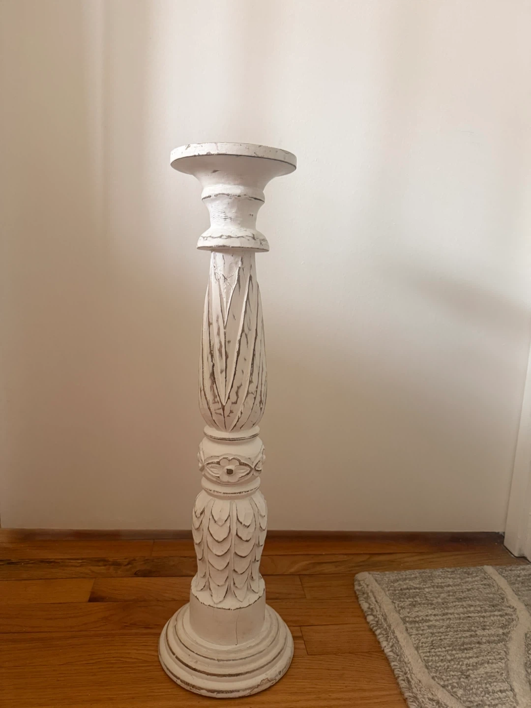 This is a distressed white pillar candle holder stand. It's made of wood and features carved detailing. Its base is round with a matching top to hold a candle. This stand would be a lovely accent for any room!