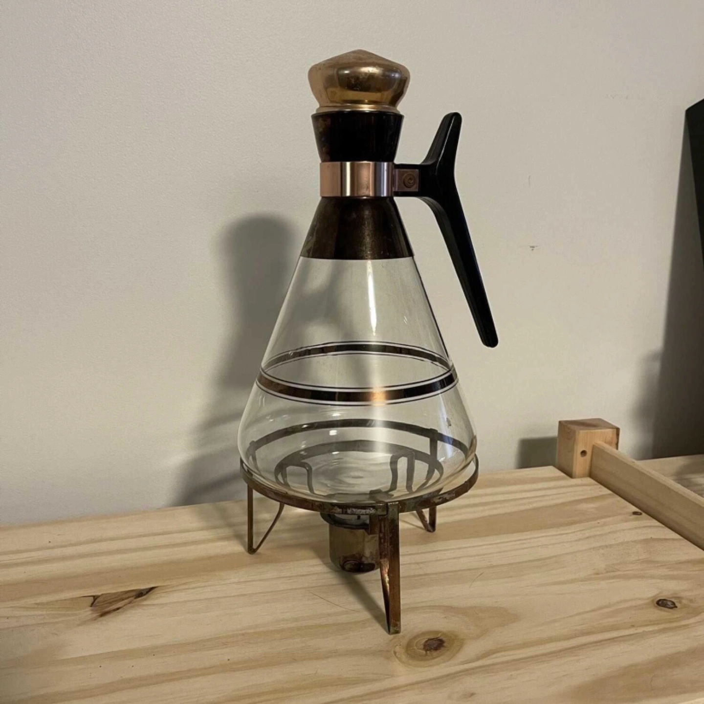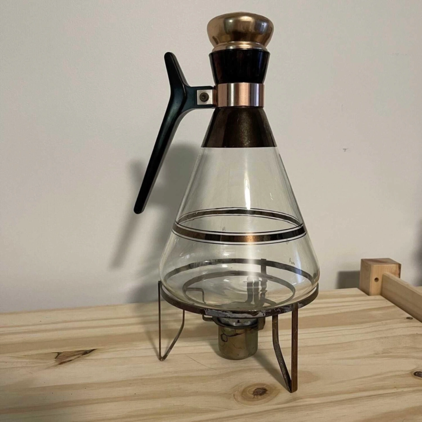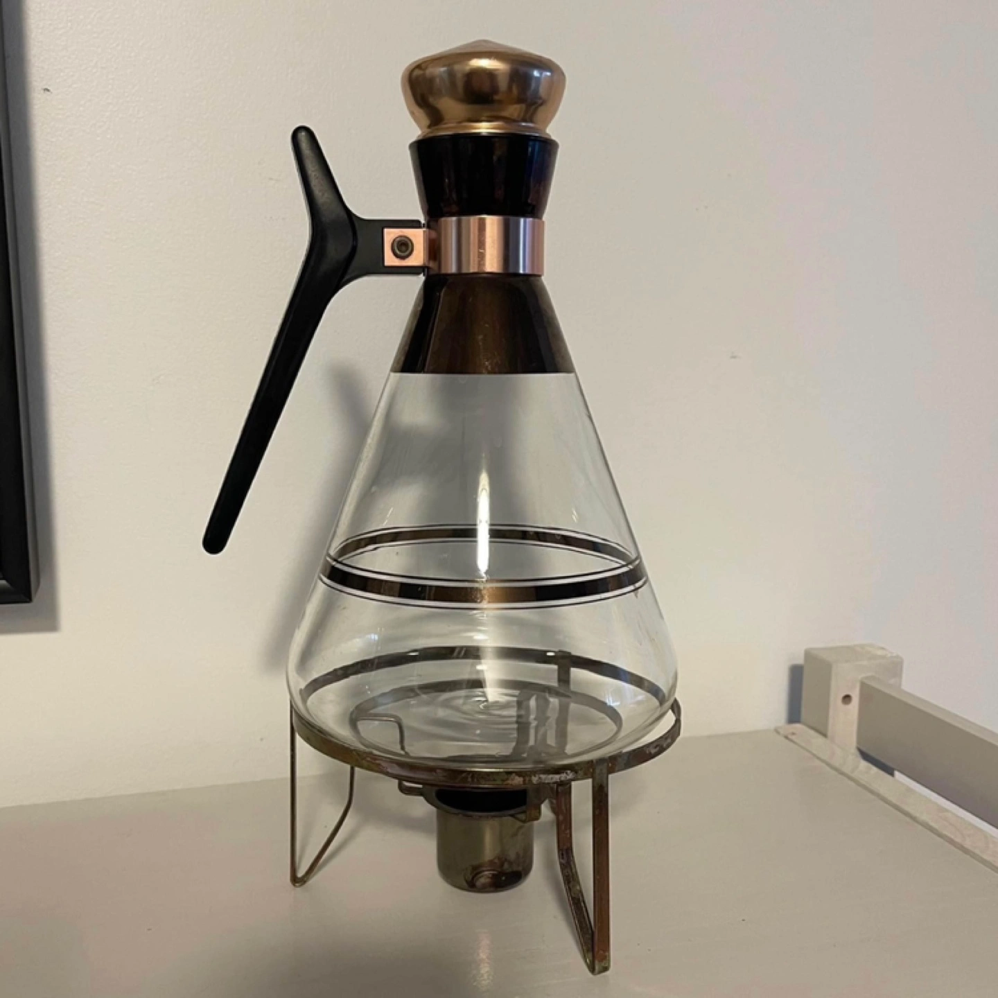 Vintage glass coffee pot with a stand and warmer. Glass features gold accents and a black plastic handle.