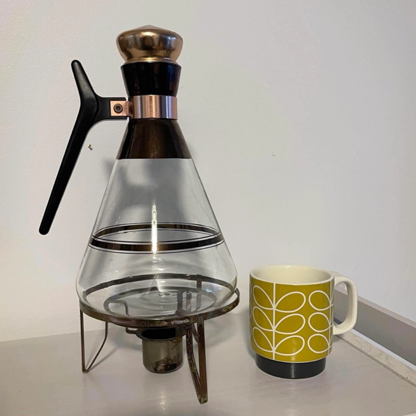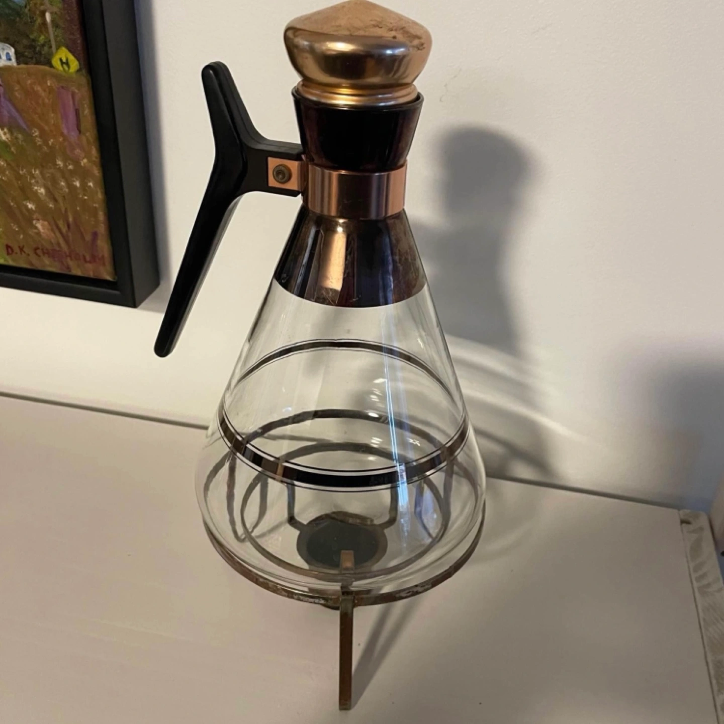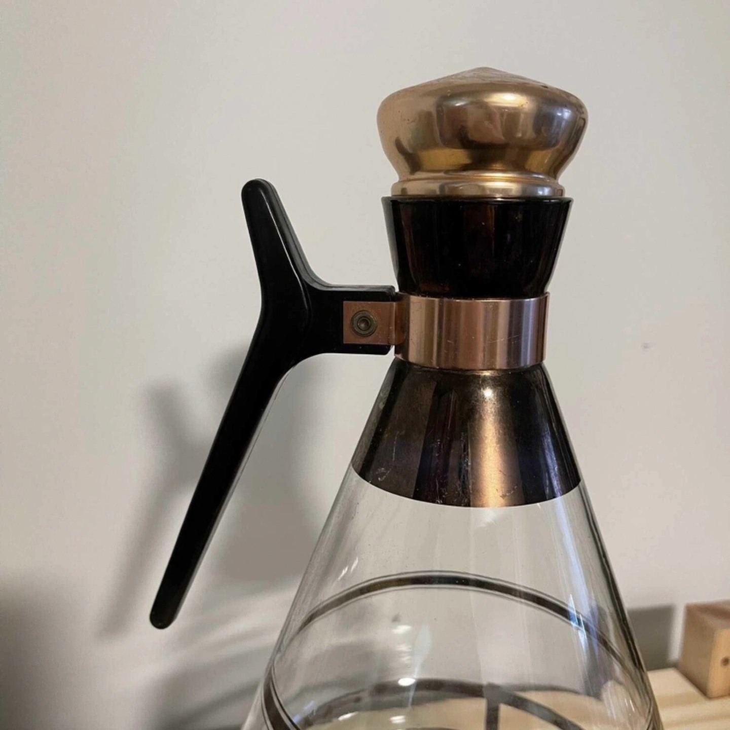 Vintage glass coffee pot with a stand and warmer. Glass features gold accents and a black plastic handle.