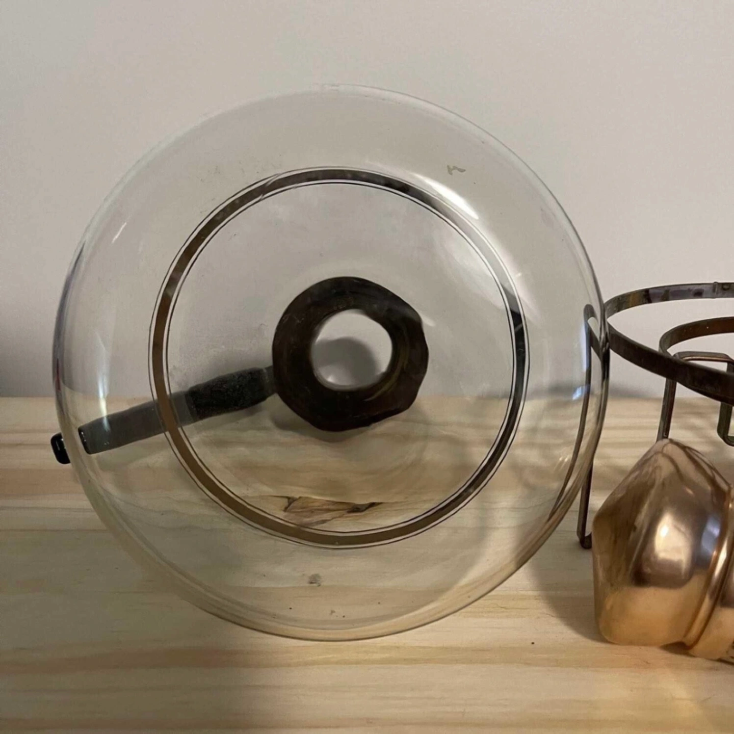 Glass and copper carafe with stand made by the Inland Glass Company in the 1950s. The copper stand has a slot to hold a candle for keeping drinks warm. The carafe comes with a cork and plastic stopper.