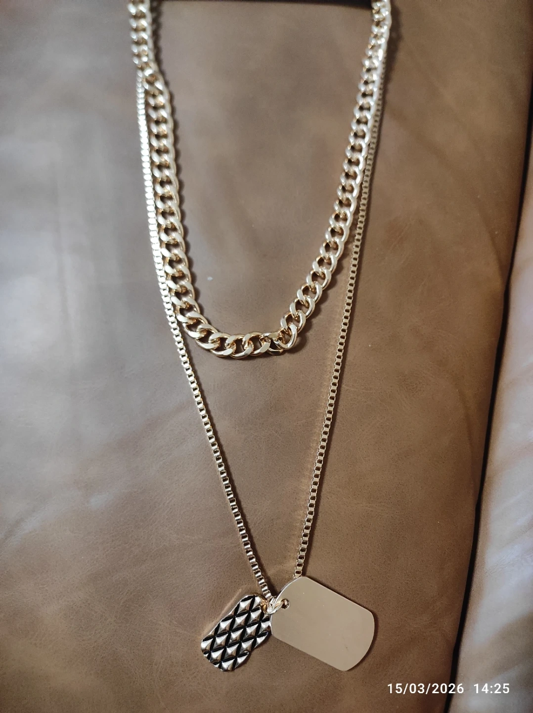 This gold-toned necklace features two layered chains, one with a cuban link style and the other a finer box chain. It's finished with two decorative dog tag pendants, one with a textured pattern and the other plain. Perfect for adding a bit of edge to your outfit!