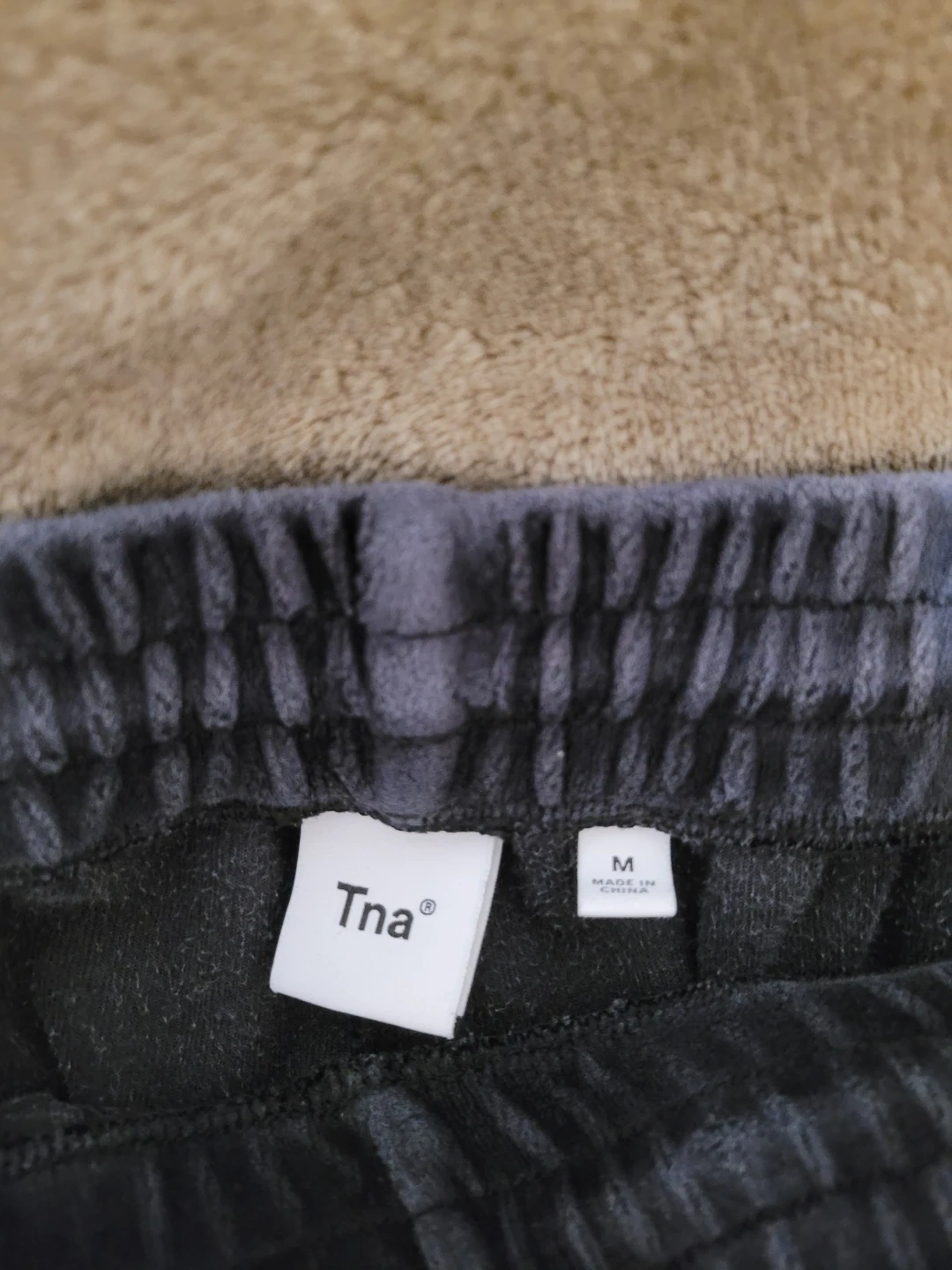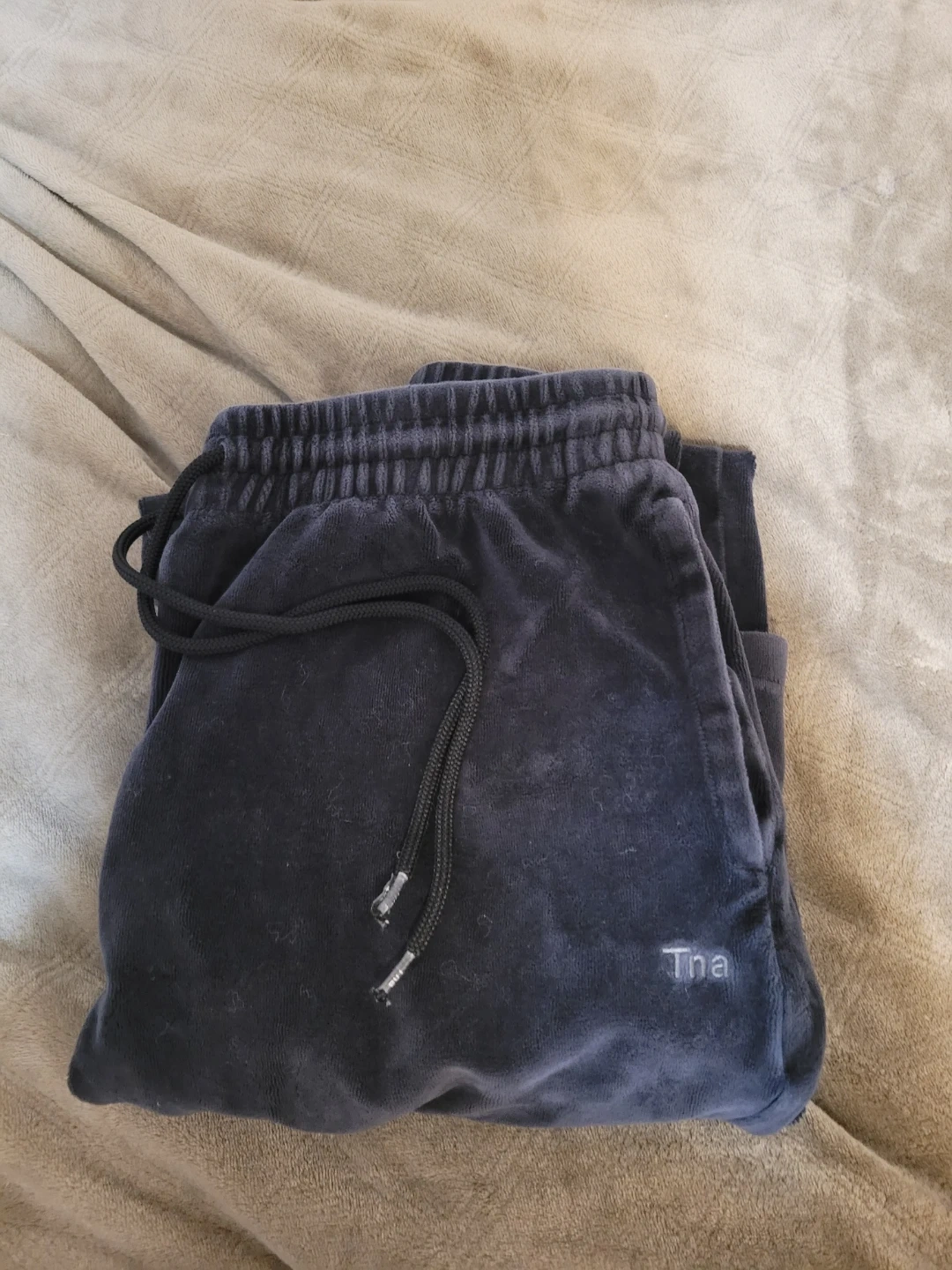 These are Tna velour lounge pants. Size medium. the drawstring tips is damaged a bit, and there's a small hole on the front left leg not very noticeable