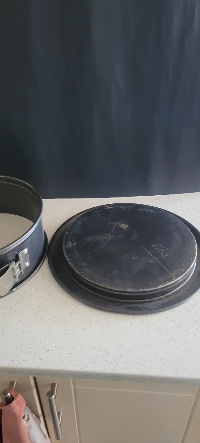 Two round springform cake pans 8 inch ans 9.5 inch diameter, respectively. Both pans have removable sides with latches for easy release.