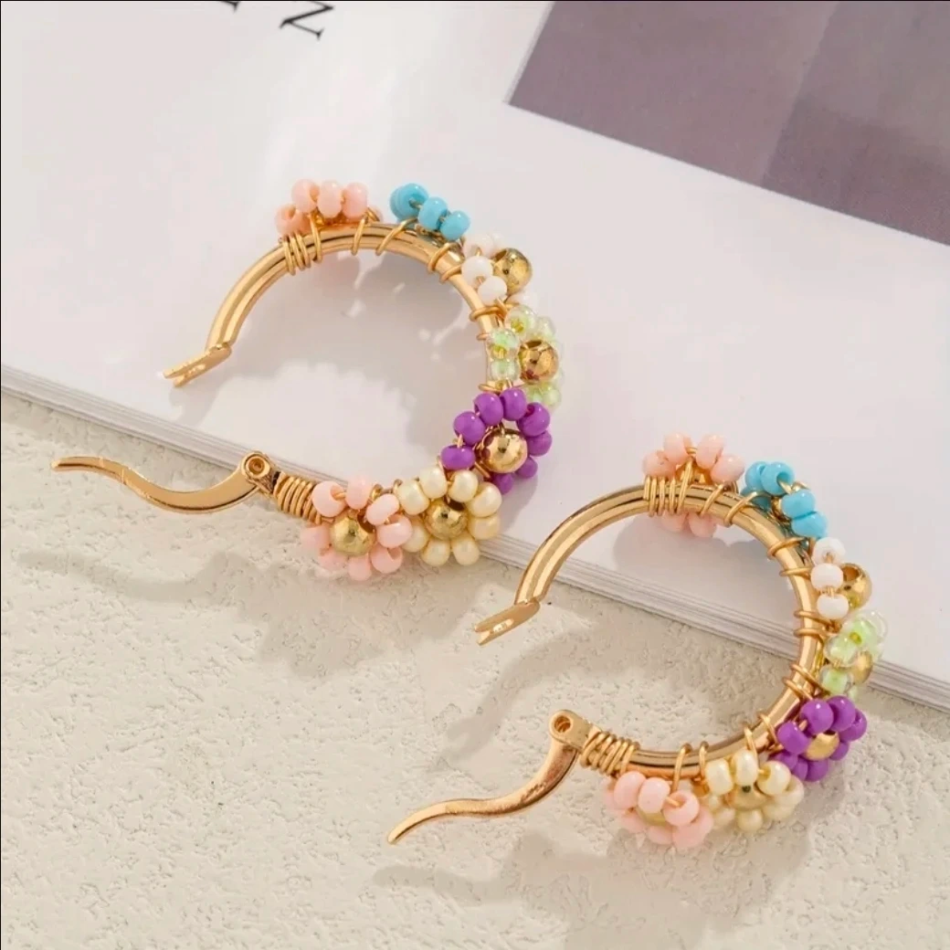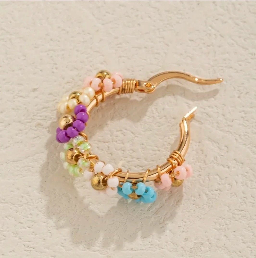 ​Add a pop of color to your outfit with these gorgeous handmade beaded hoop earrings. Featuring delicate glass bead "daisy" flowers in a vibrant multicolor palette, these hoops are perfect for spring and summer.
