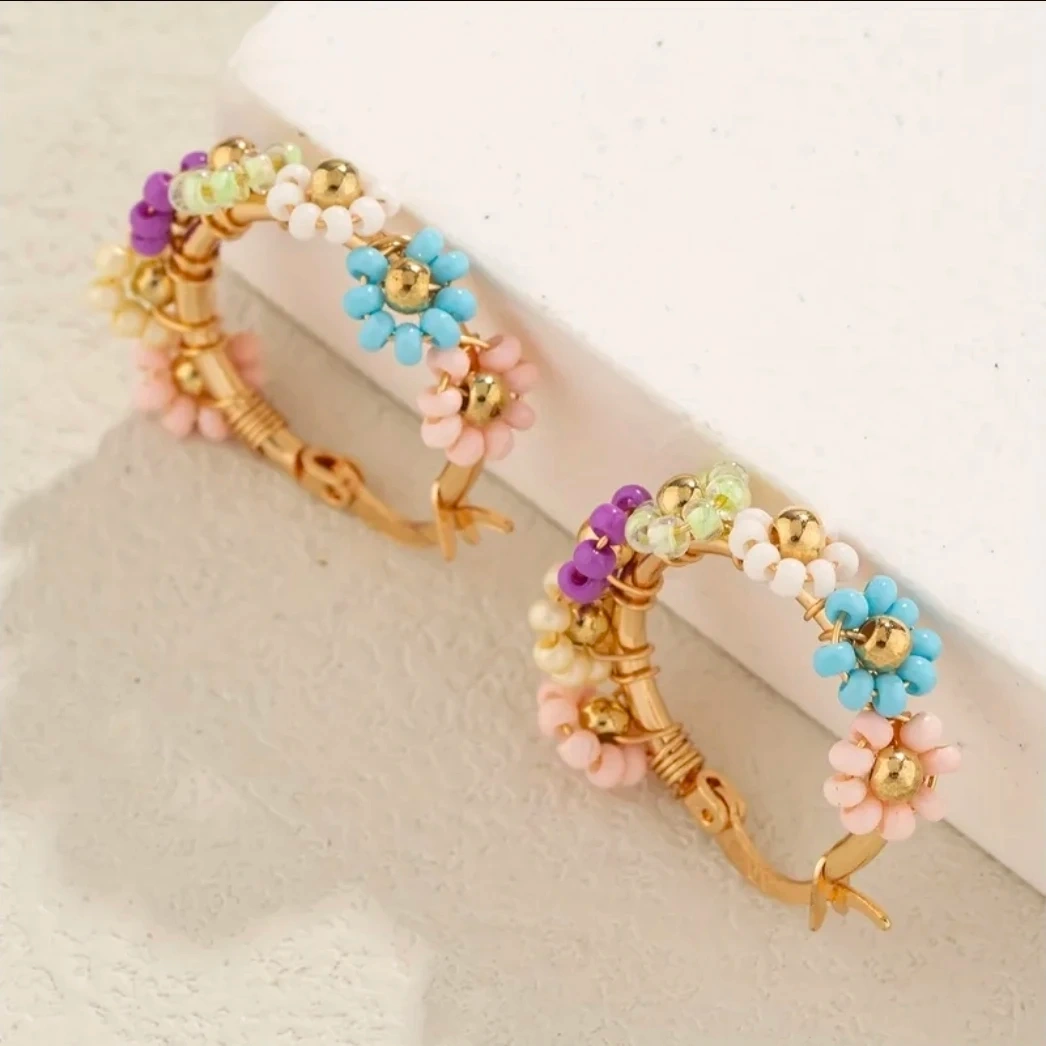 ​Add a pop of color to your outfit with these gorgeous handmade beaded hoop earrings. Featuring delicate glass bead "daisy" flowers in a vibrant multicolor palette, these hoops are perfect for spring and summer.