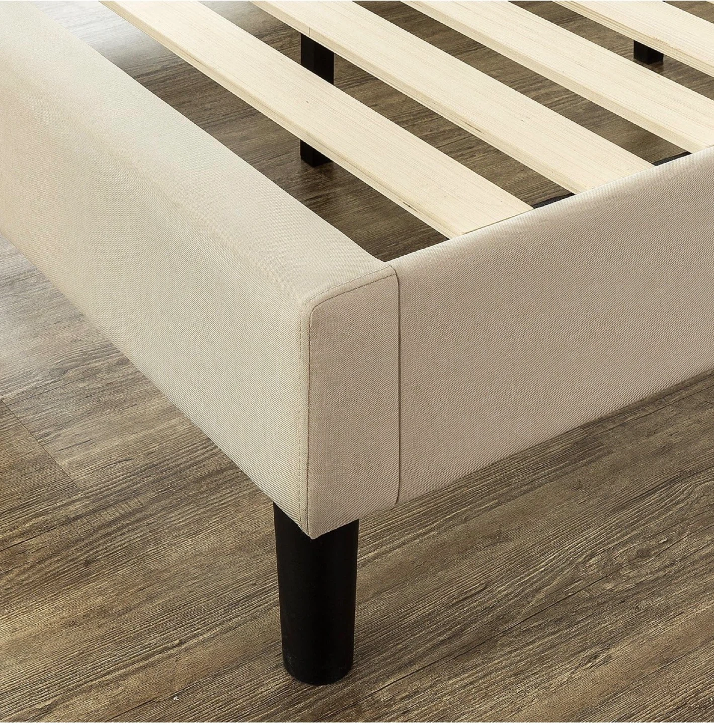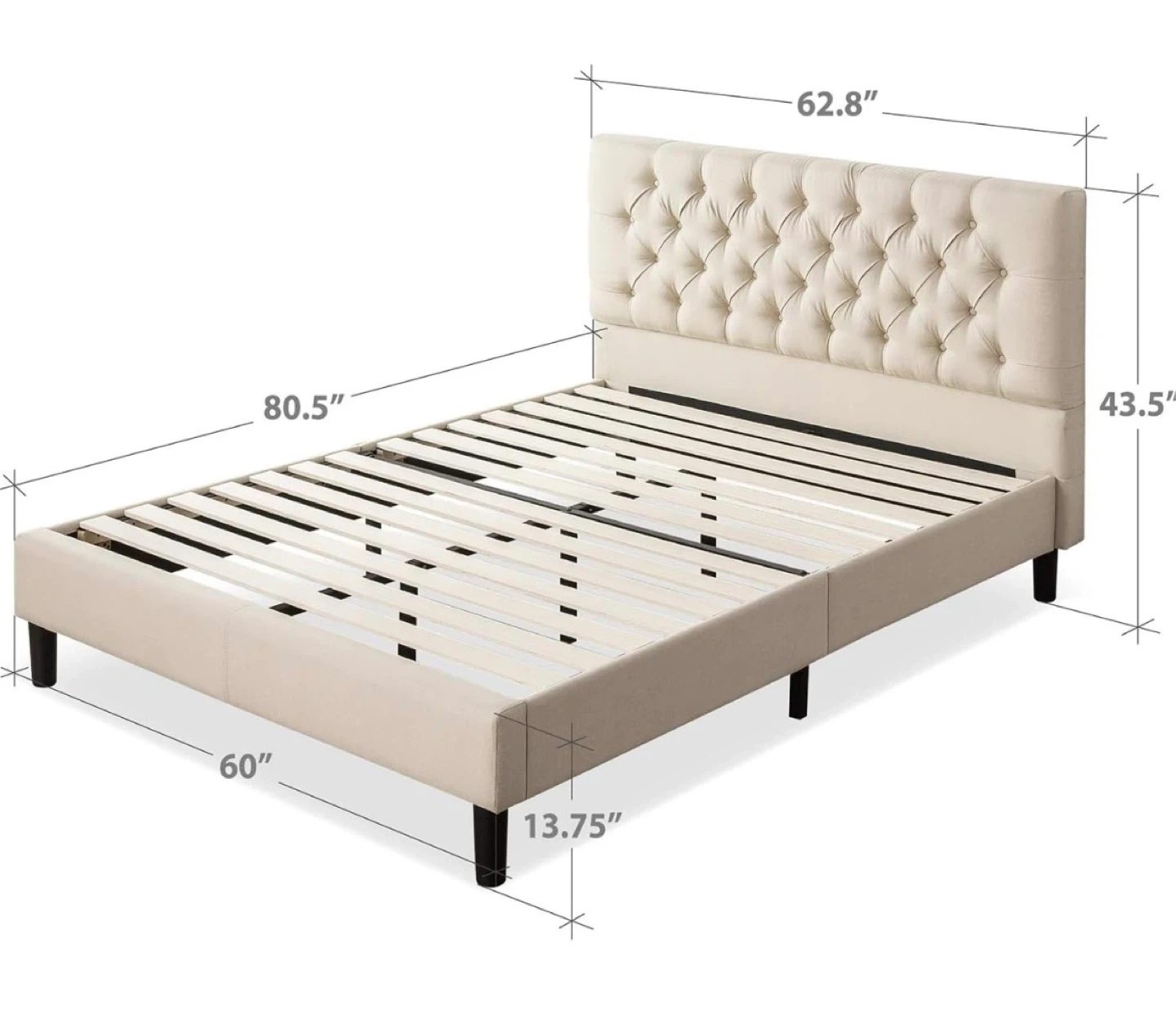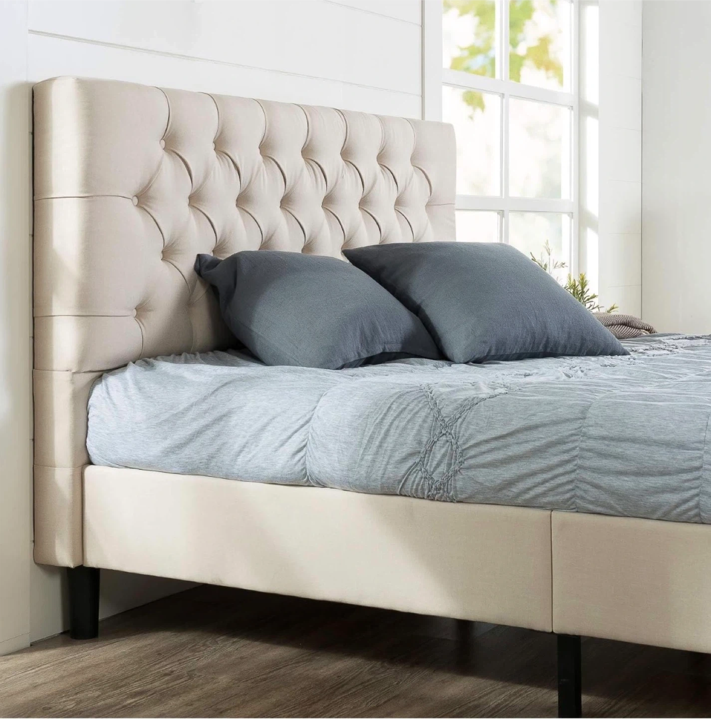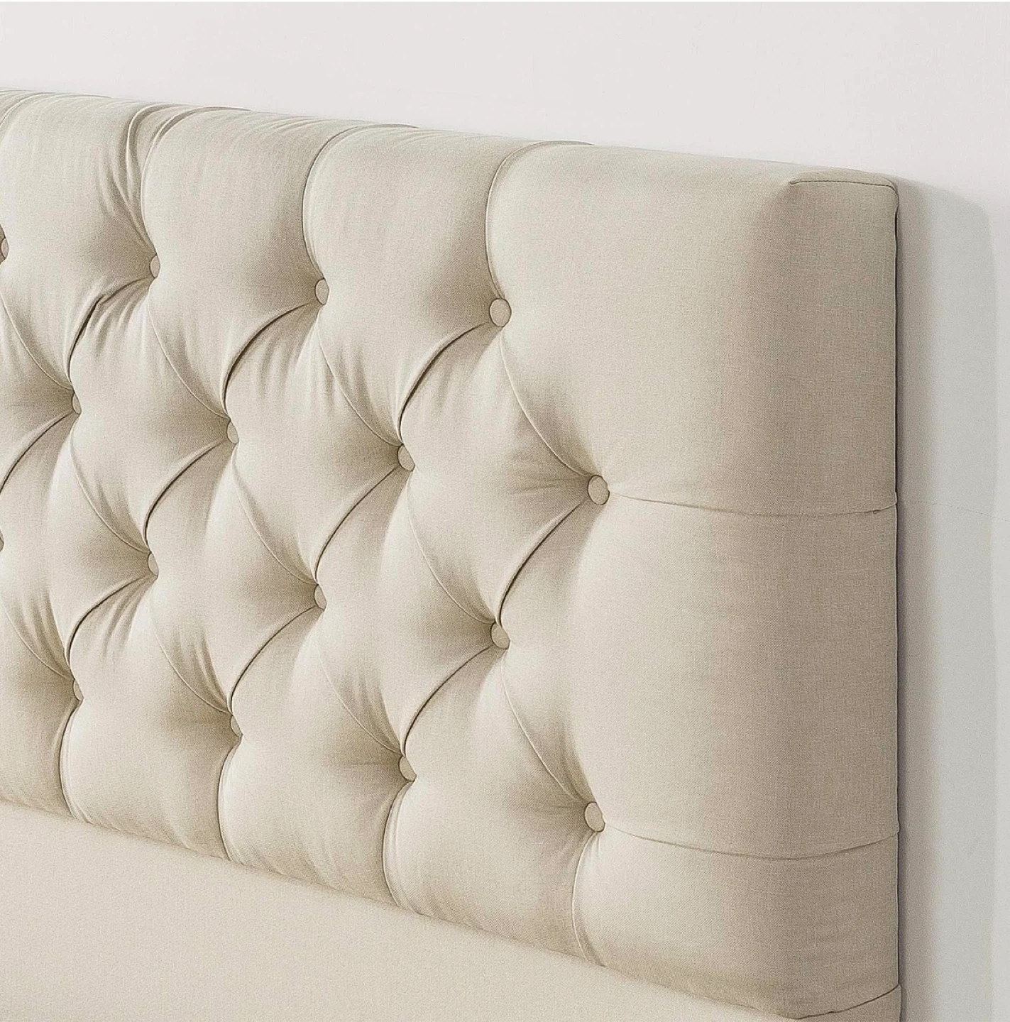This is a queen-size upholstered platform bed frame in a neutral colour. The headboard features button-tufted detailing.
