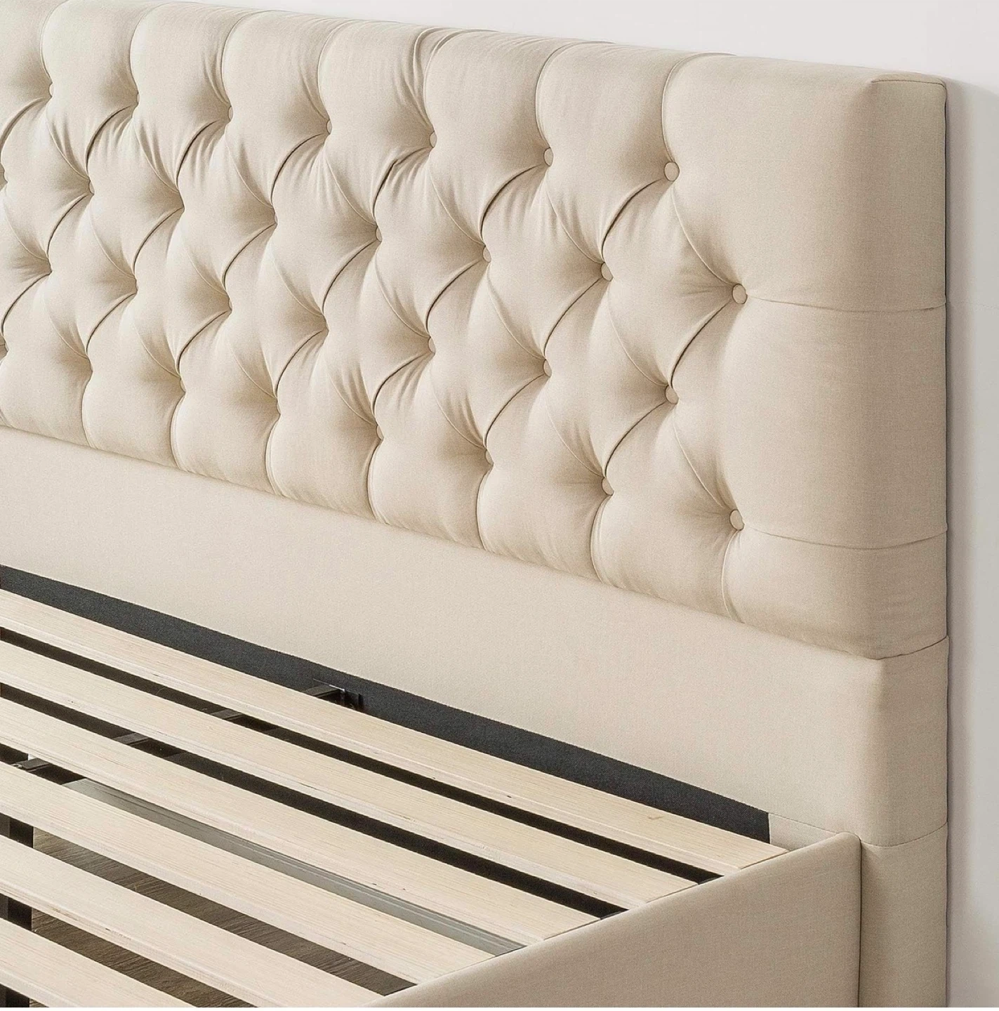 This is a queen-size upholstered platform bed frame in a neutral colour. The headboard features button-tufted detailing.