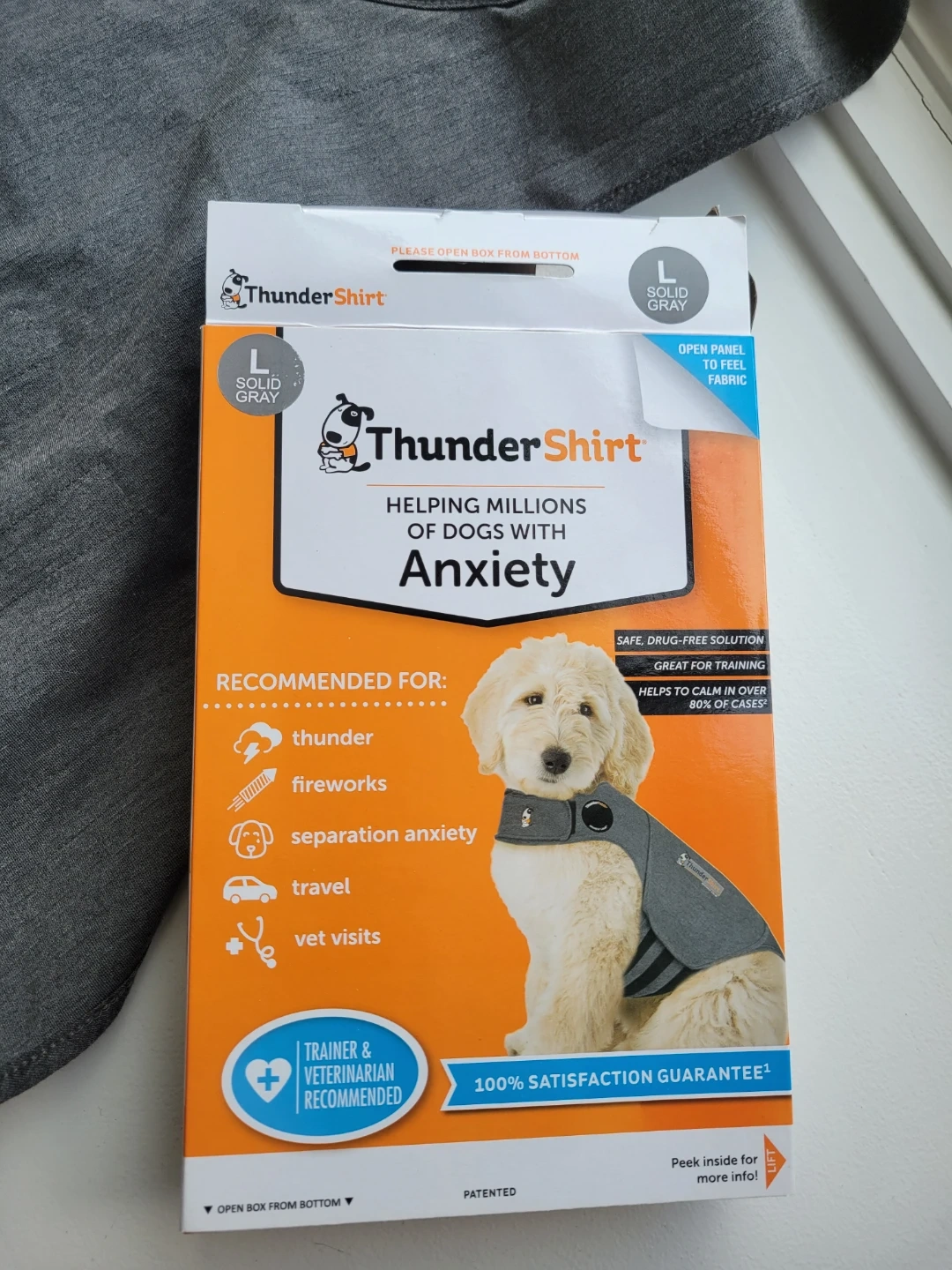 Give your furry friend the gift of calm with this Thundershirt, size large! used once. Thundershirt is designed to help dogs cope with anxiety during thunderstorms, fireworks, separation, travel, and vet visits. It applies gentle, constant pressure, similar to swaddling a baby, to help your dog feel more secure and relaxed.