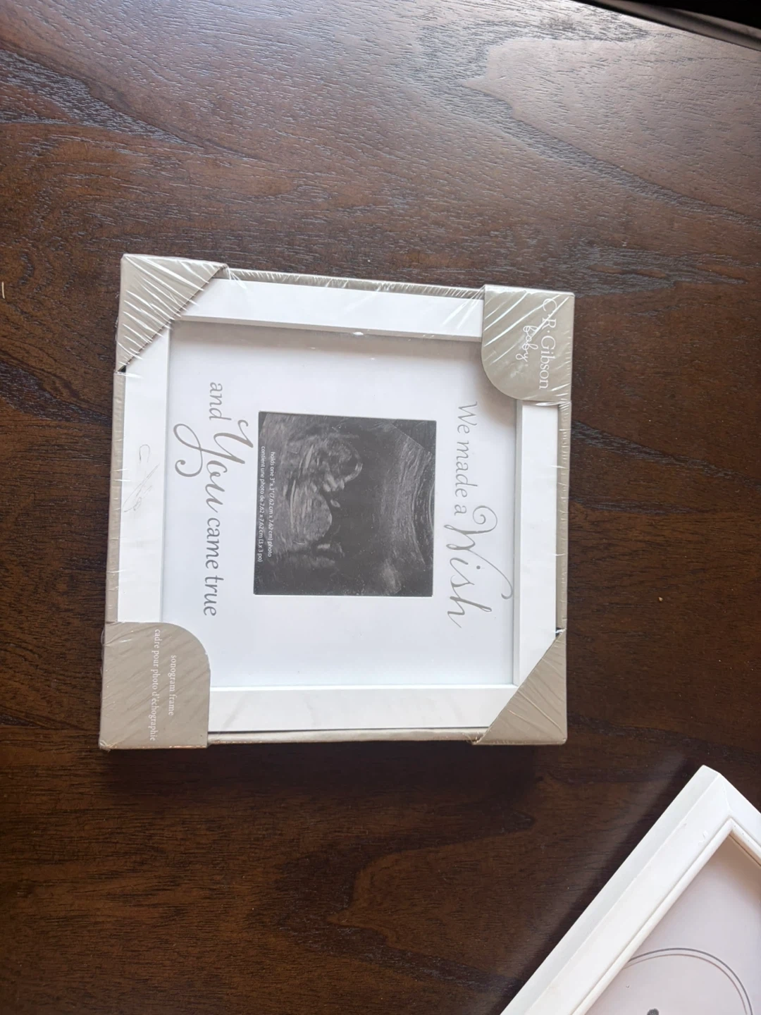 C.R. Gibson Baby sonogram frame with "We made a wish and You came true" text. Holds one 3"x3" (7.62 cm x 7.62 cm) photo. It's a sweet way to capture a special memory!