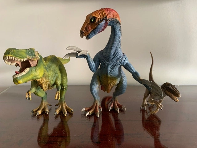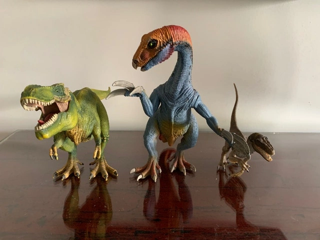 All three dinosaurs' mouths articulate—open and close—and the middle blue dinosaur’s arms move as well. High-quality toys, retired pieces.