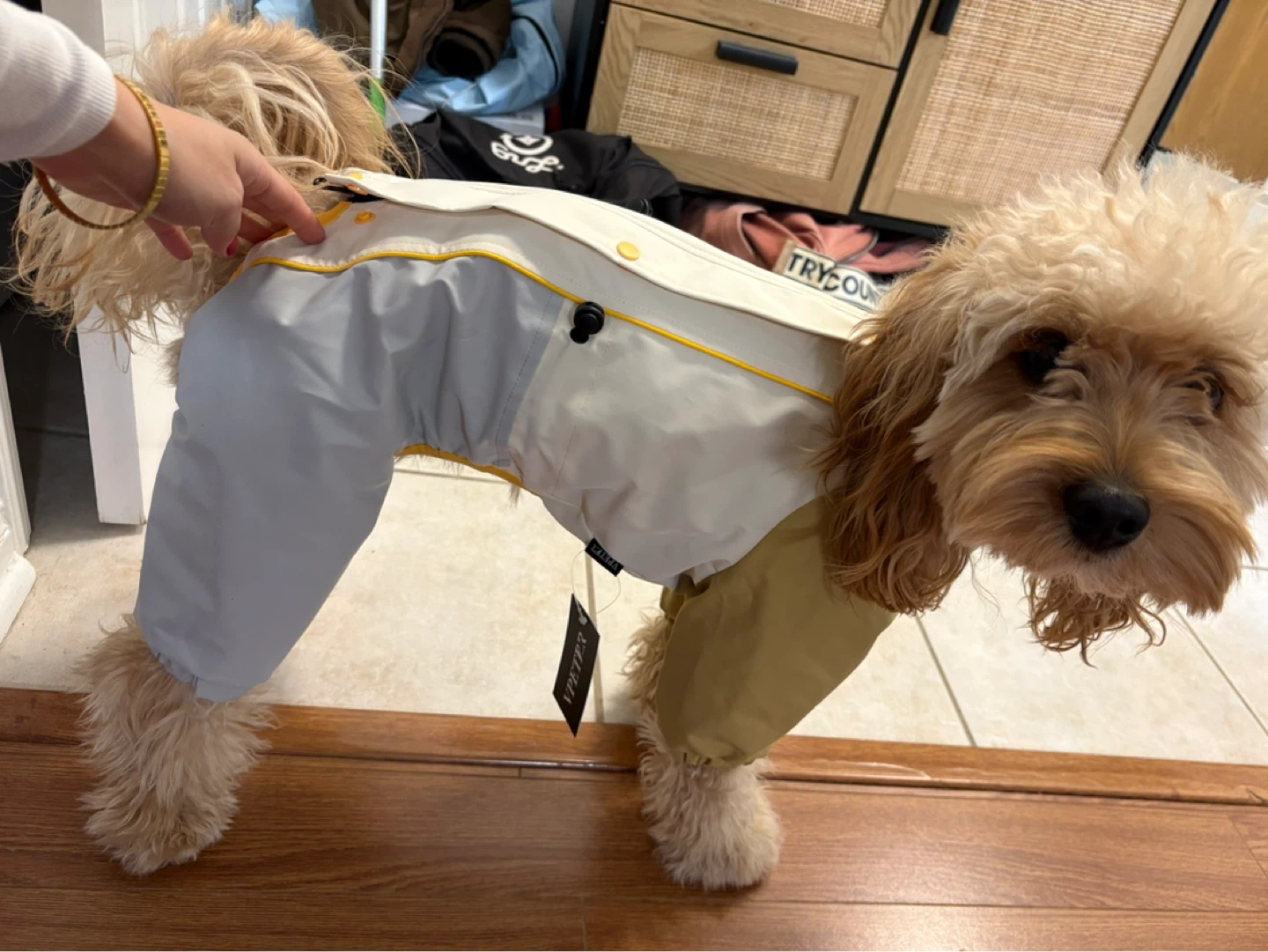 My dog weighs 9 kg, and this outfit is a bit tight for him.