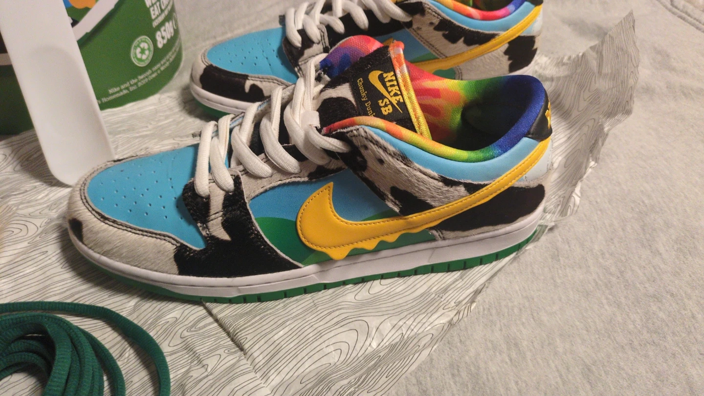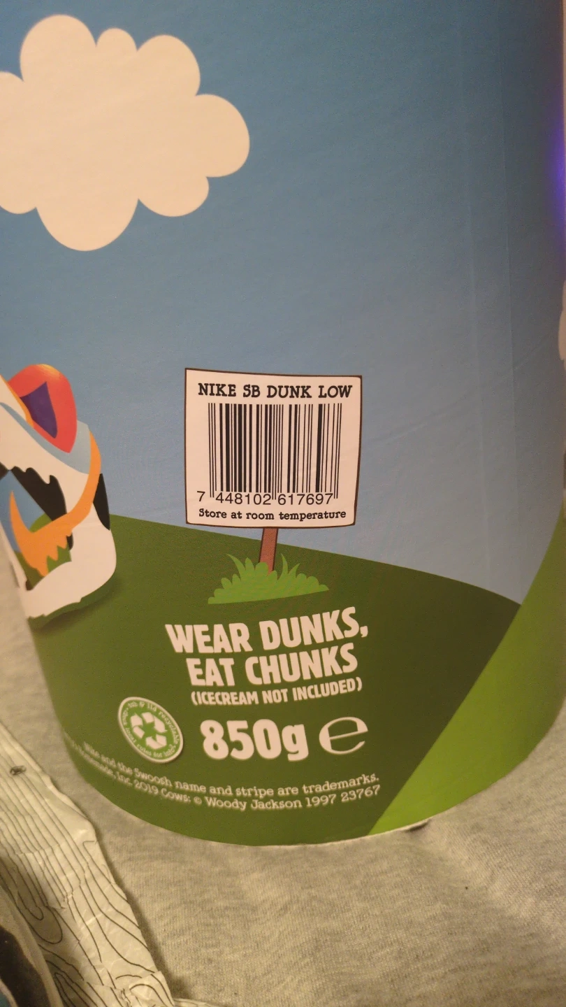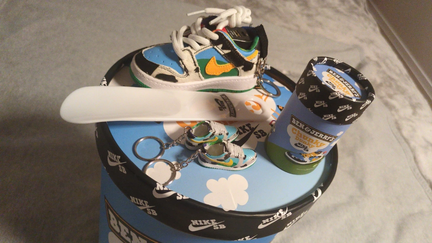 Selling a pair of Nike SB Dunk Low Ben & Jerry's Chunky Dunky sneakers. This is a complete collector set. This is the ultimate presentation kit featuring the massive friends and family style oversized ice cream tub and all the rare accessories that make this a true display piece. It comes with the authentic wood grain Nike SB tissue paper, branded ice cream, spoon miniature ice cream, pint USB drive, two matching Nike SB dunk keychain charms and two extra laces, yellow and green included.
