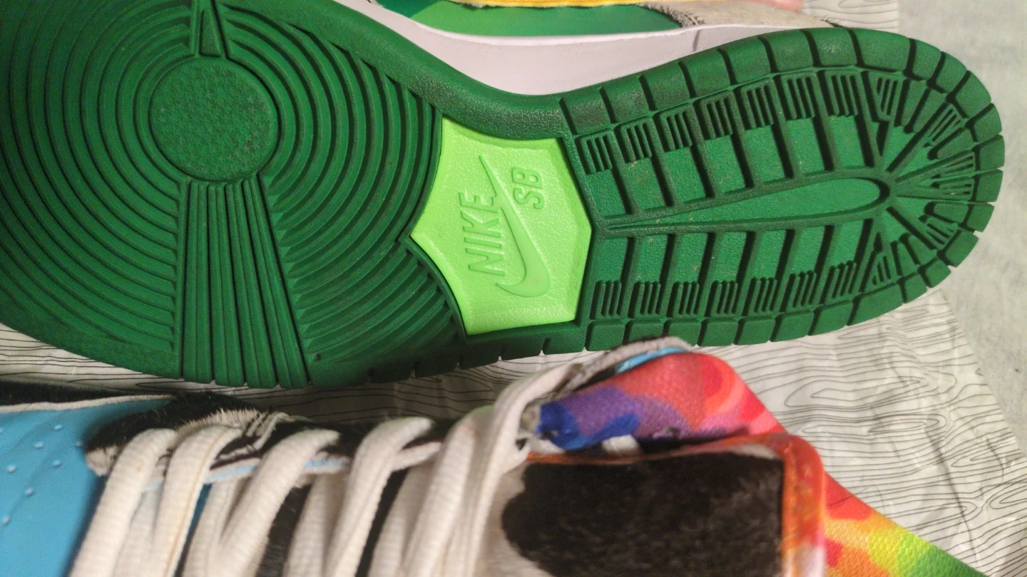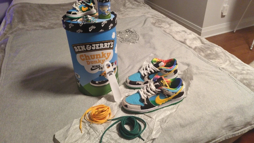 Selling a pair of Nike SB Dunk Low Ben & Jerry's Chunky Dunky sneakers. This is a complete collector set. This is the ultimate presentation kit featuring the massive friends and family style oversized ice cream tub and all the rare accessories that make this a true display piece. It comes with the authentic wood grain Nike SB tissue paper, branded ice cream, spoon miniature ice cream, pint USB drive, two matching Nike SB dunk keychain charms and two extra laces, yellow and green included.