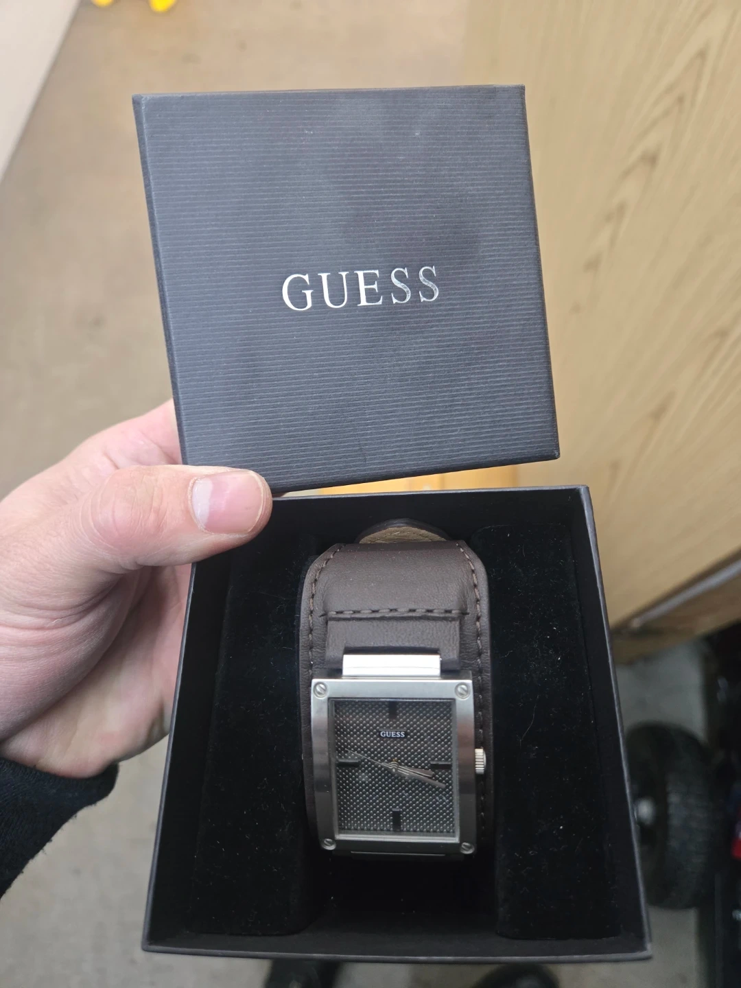This is a Guess watch with a brown leather band and silver-toned casing. It comes in its original Guess box. The watch has a dark grey, textured face.