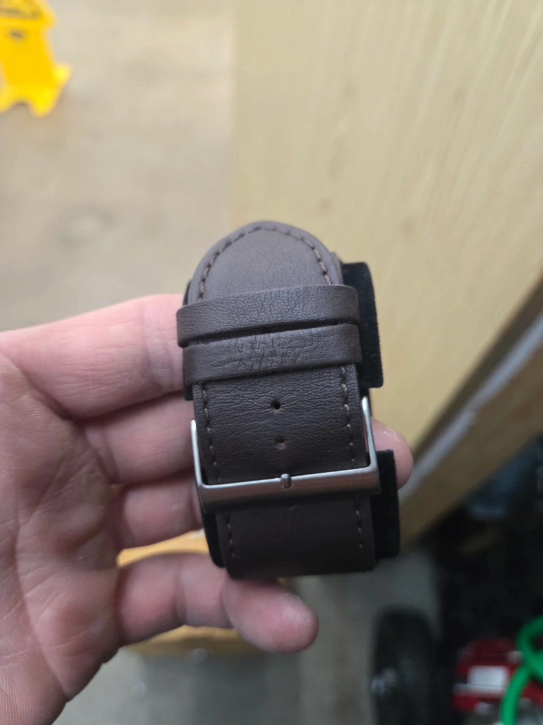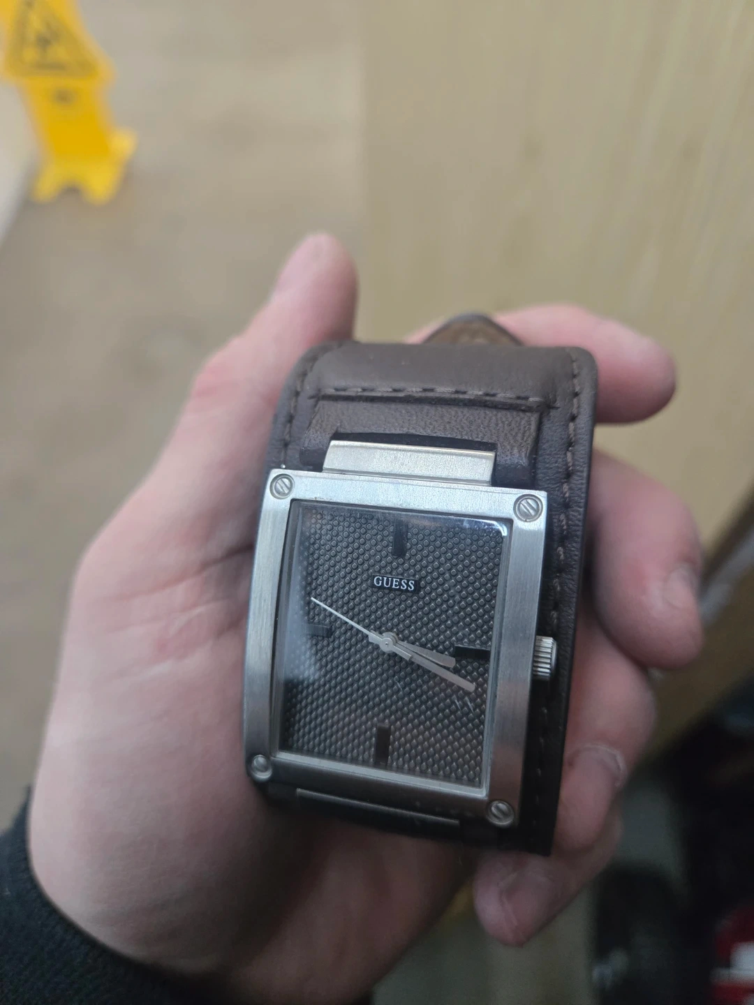 This is a Guess watch with a brown leather band and silver-toned casing. It comes in its original Guess box. The watch has a dark grey, textured face.