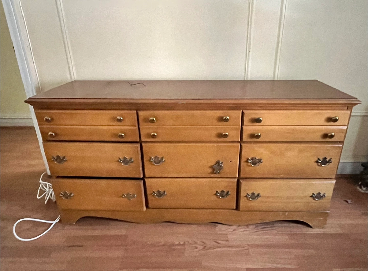 Here's a wooden dresser with nine drawers. It has a light brown color and ornate drawer pulls. It would be great for storing clothes or other items. Located in Sunnyside Queens. Must have your own transportation