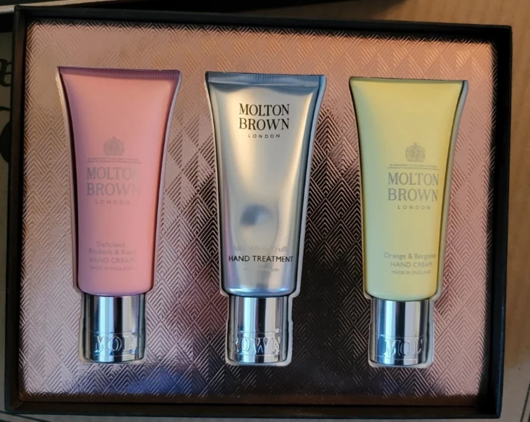 This new Molton Brown hand cream set includes three travel-sized tubes in a lovely gift box with lid. You'll get the Orange & Bergamot Hand Cream, Delicious Rhubarb & Rose Hand Cream, and Alba White Truffle Hand Treatment. All made in England.