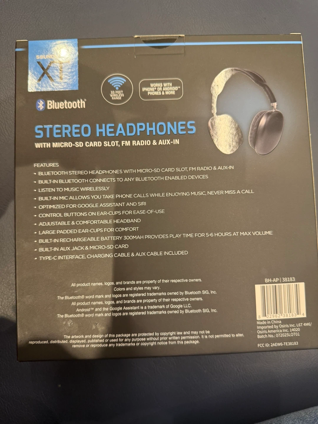 Selling a new pair of Soundlogic XT Stereo Headphones! They come in the original box and feature Bluetooth connectivity, a micro-SD card slot, FM radio, and an AUX-in port. The box also includes a Type-C interface, charging cable, and AUX cable. Enjoy wireless music, hands-free calls, and comfortable earcups! Bought them recently and left untouched just for you!