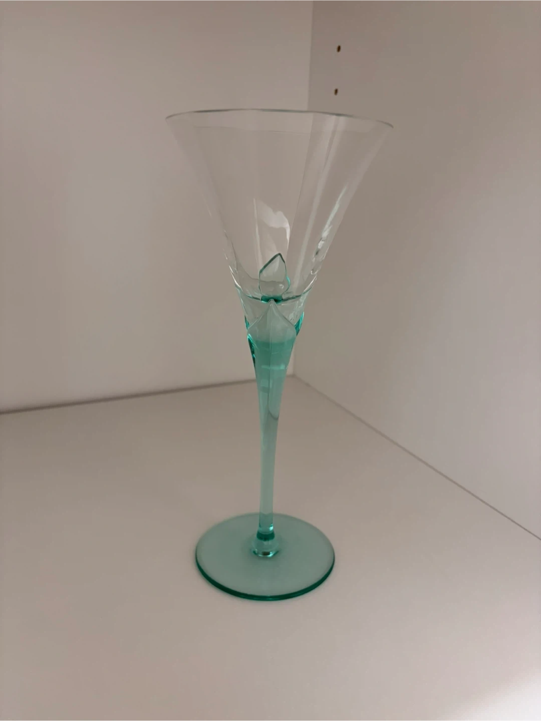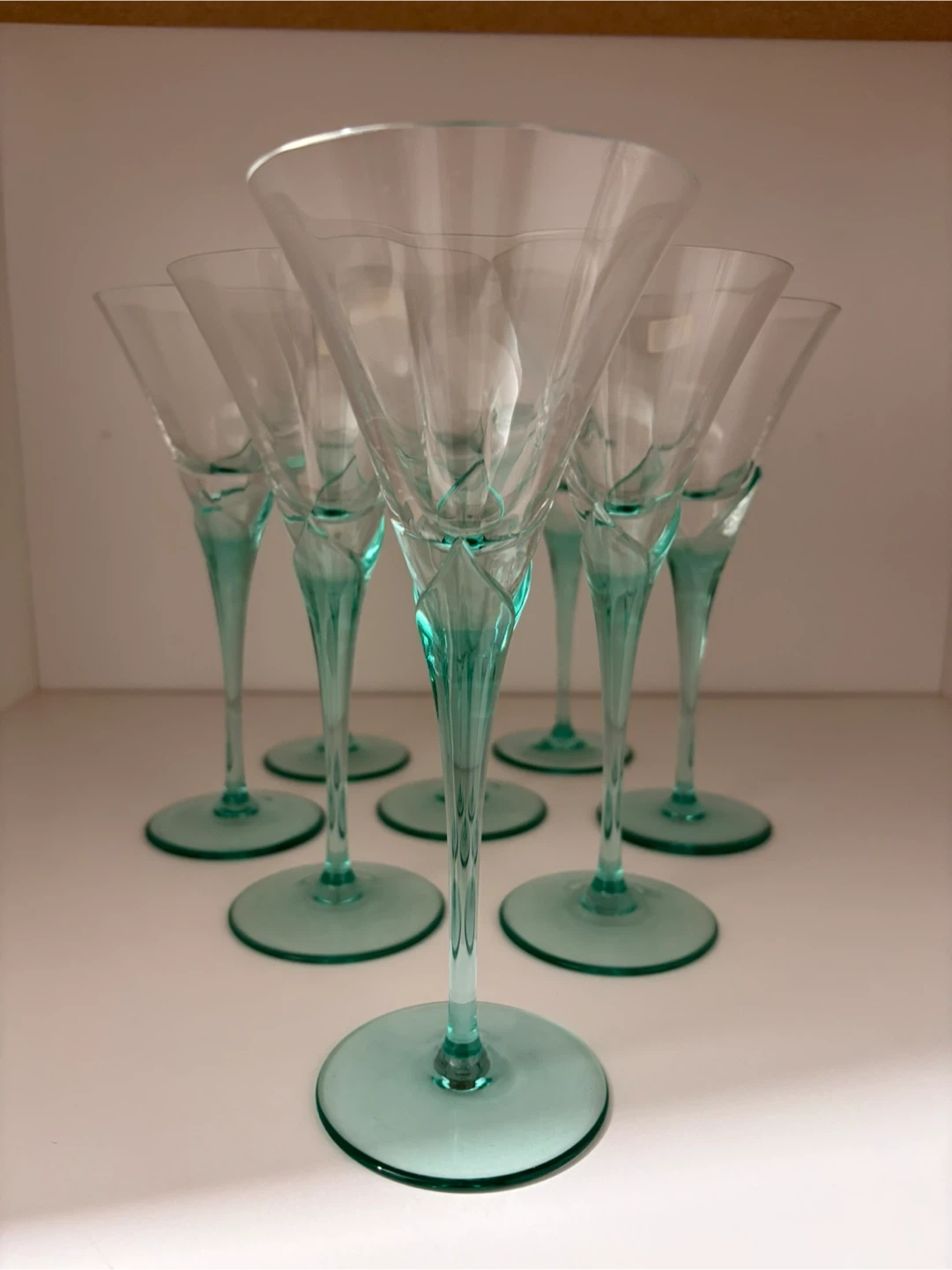 Set of eight Mikasa crystal martini glasses with teal stems and bases. These elegant glasses have a unique twisted stem design. Perfect for serving cocktails at your next gathering!