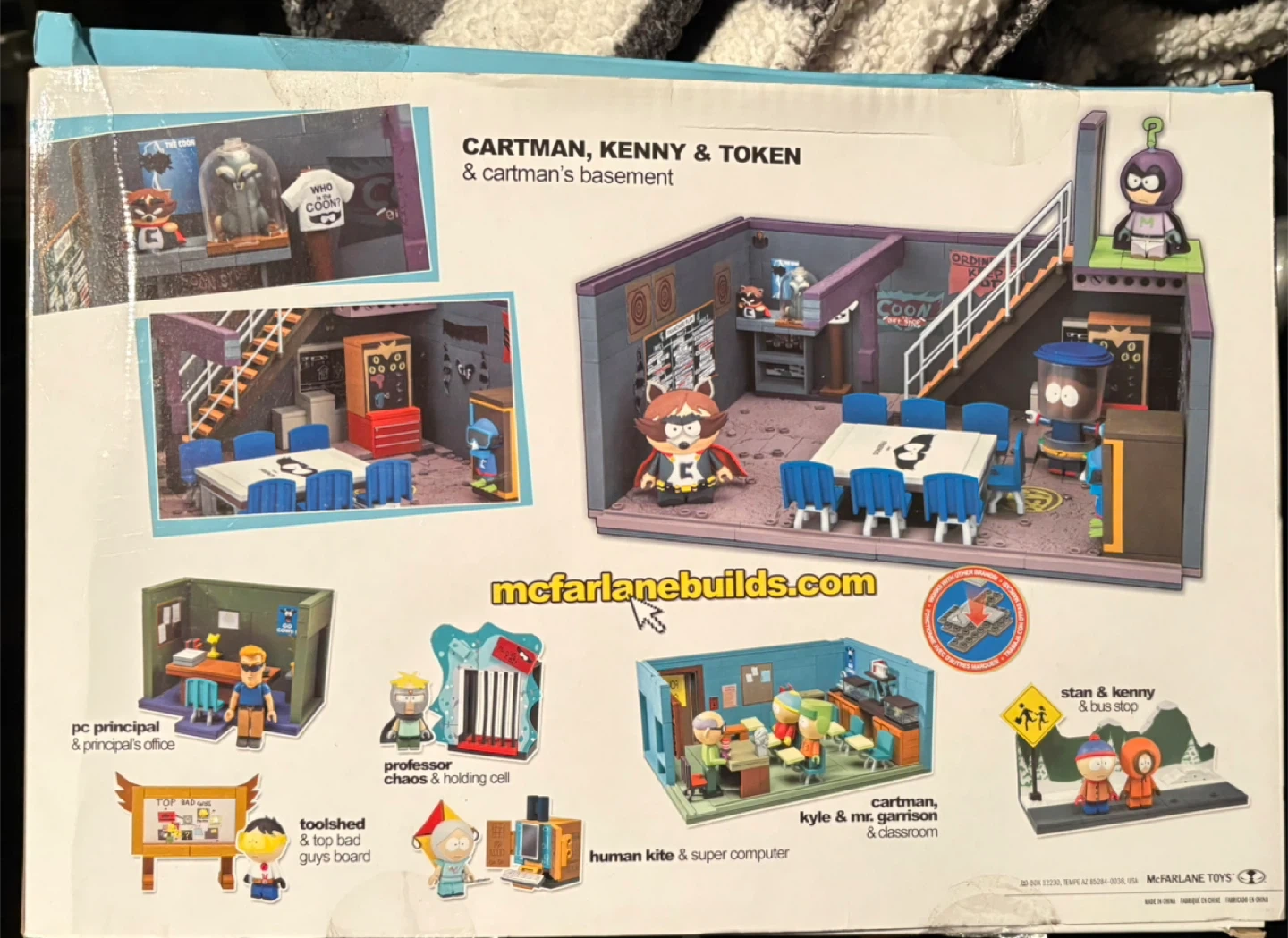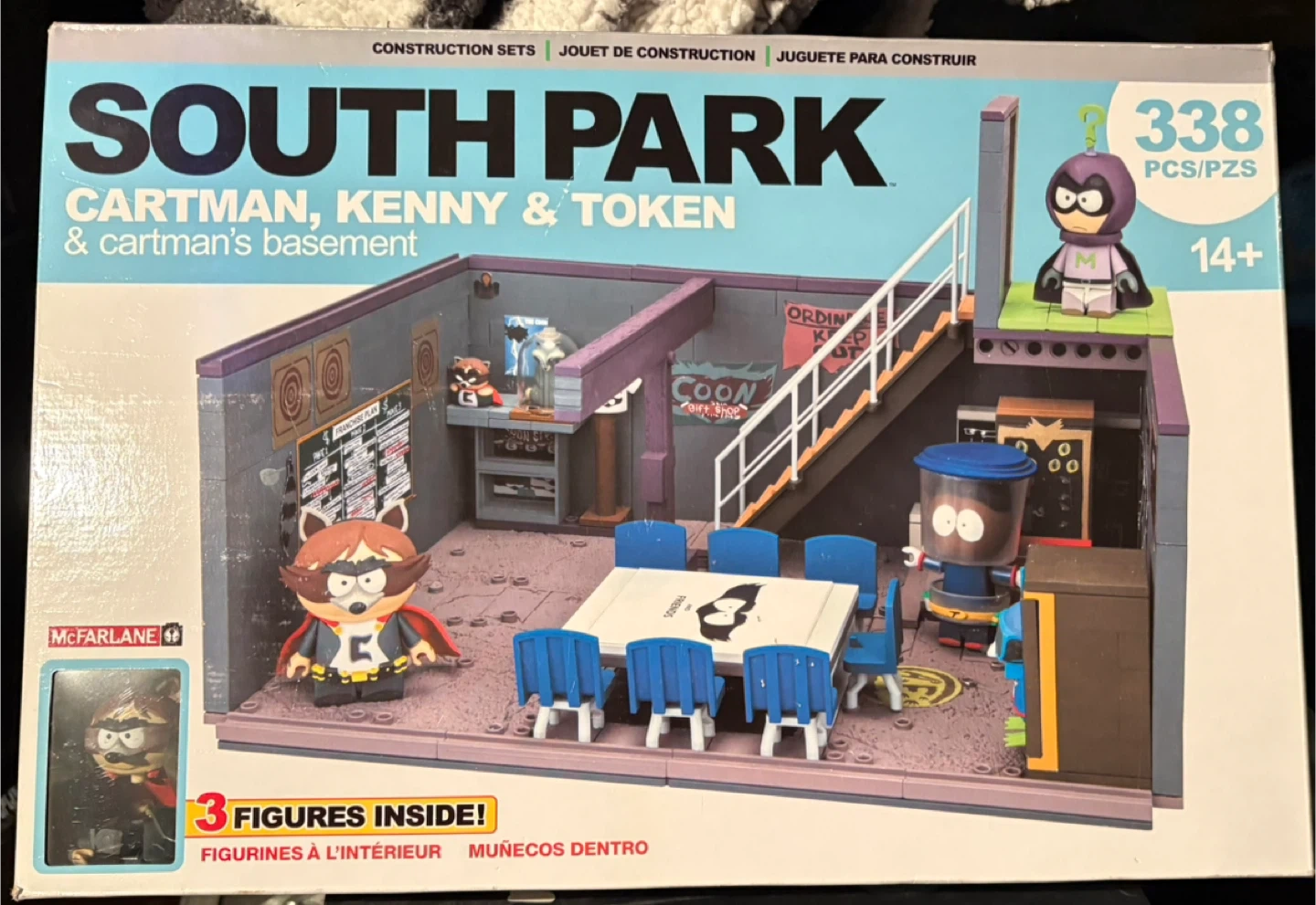 This McFarlane construction set features Cartman, Kenny & Token with Cartman's basement. It includes 3 figures and is recommended for ages 14+. The set has 338 pieces.
