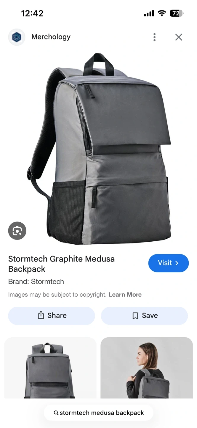 This is a Stormtech Medusa backpack. It features the Google Cloud logo embroidered on the front. The backpack is grey and is brand new with tags .