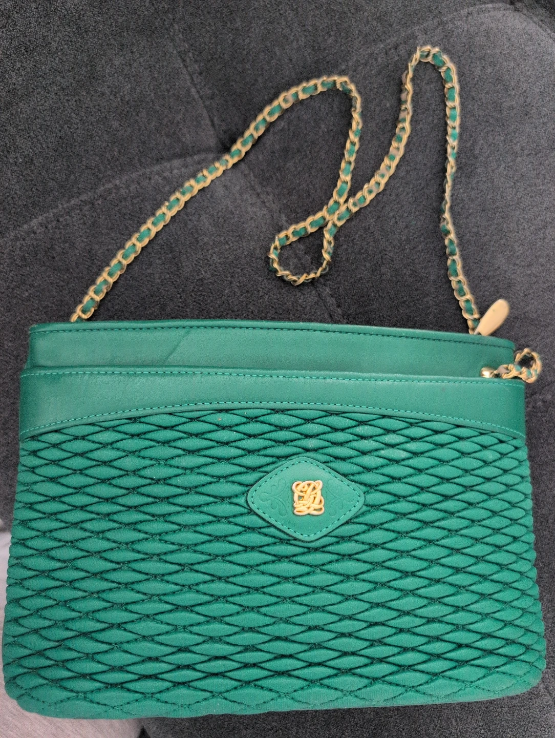 A beautiful Emerald Green Louis Quatorze (French luxury brand) shoulder bag with a gold chain strap. It features a quilted exterior and both an inner and outer zippered pocket. Some minor scuffs are visible on the exterior - this bag was pre-loved by my mother.